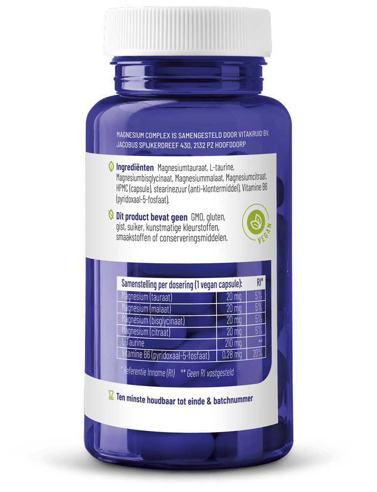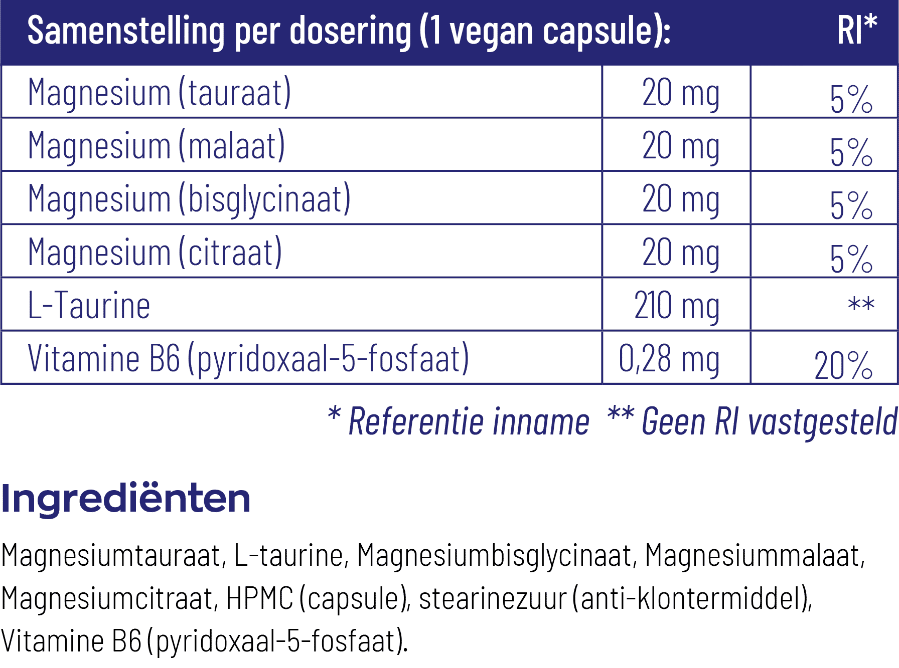 Magnesiumtauraat, L-taurine, Magnesiumcitraat, magnesiumbisglycinaat, magnesiummalaat, stearinezuur (anti-klontermiddel), HPMC (capsule), Vitamine B6 (pyridoxaal-5-fosfaat).