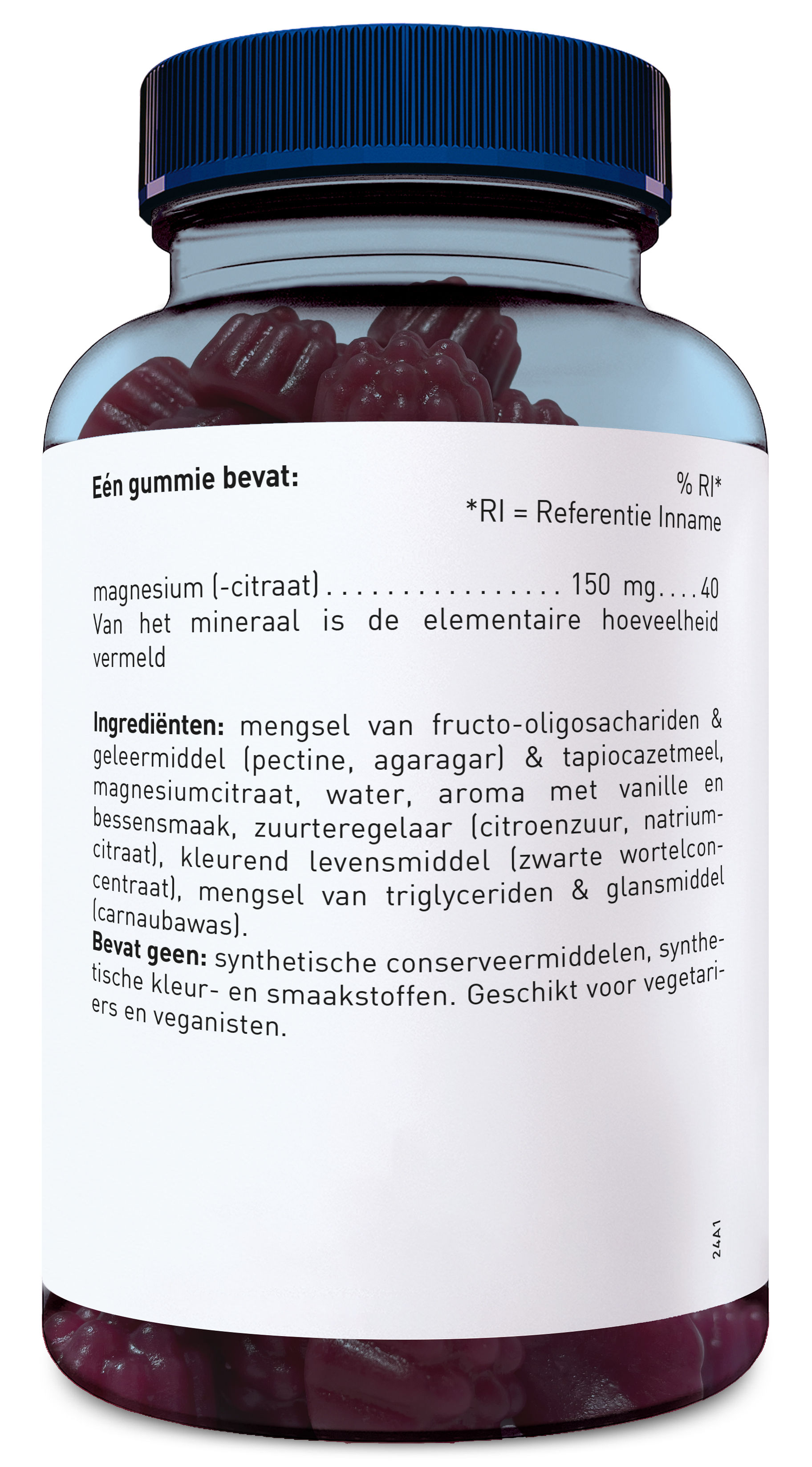 Mengsel van fructo-oligosachariden & geleermiddel (pectine, agaragar) & tapiocazetmeel, magnesiumcitraat, water, aroma met vanille en bessensmaak, zuurteregelaar (citroenzuur, natriumcitraat), kleurend levensmiddel (zwarte wortelconcentraat), mengsel van triglyceriden & glansmiddel (carnaubawas).