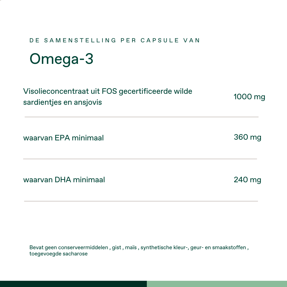 VISolieconcentraat, capsulewand (VISgelatine, glycerol, water), antioxidant (tocoferolrijk extract).