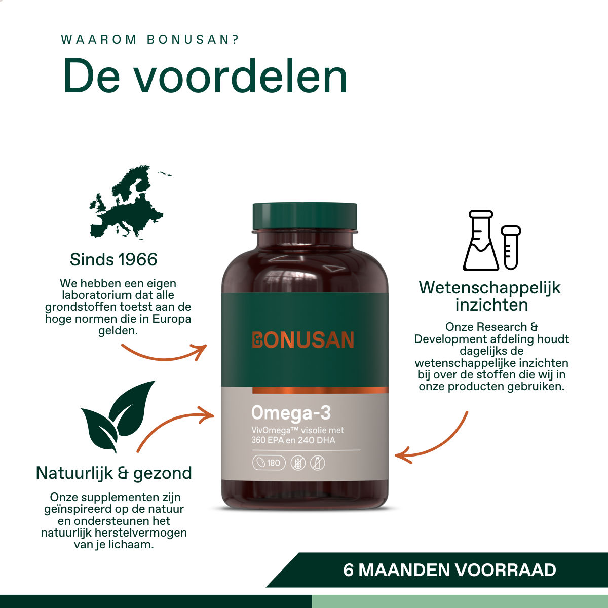 Bonusan Omega-3 is hét basissupplement dat voorziet in je dagelijkse omega-3 behoefte. De makkelijk slikbare softgels bevatten een krachtige dosis van 360 mg EPA en 240 mg DHA in de vorm van natuurlijke, zeer goed opneembare triglyceriden. Dankzij geavanceerde filtratie is de visolie buitengewoon zuiver en daardoor geur- en smaakloos. Bovendien is de vis voor de olie gecertificeerd duurzaam gevangen (FOS, Friend of the Sea) en heeft een lage eco-footprint. Verantwoord dus, voor jezelf én je omgeving.