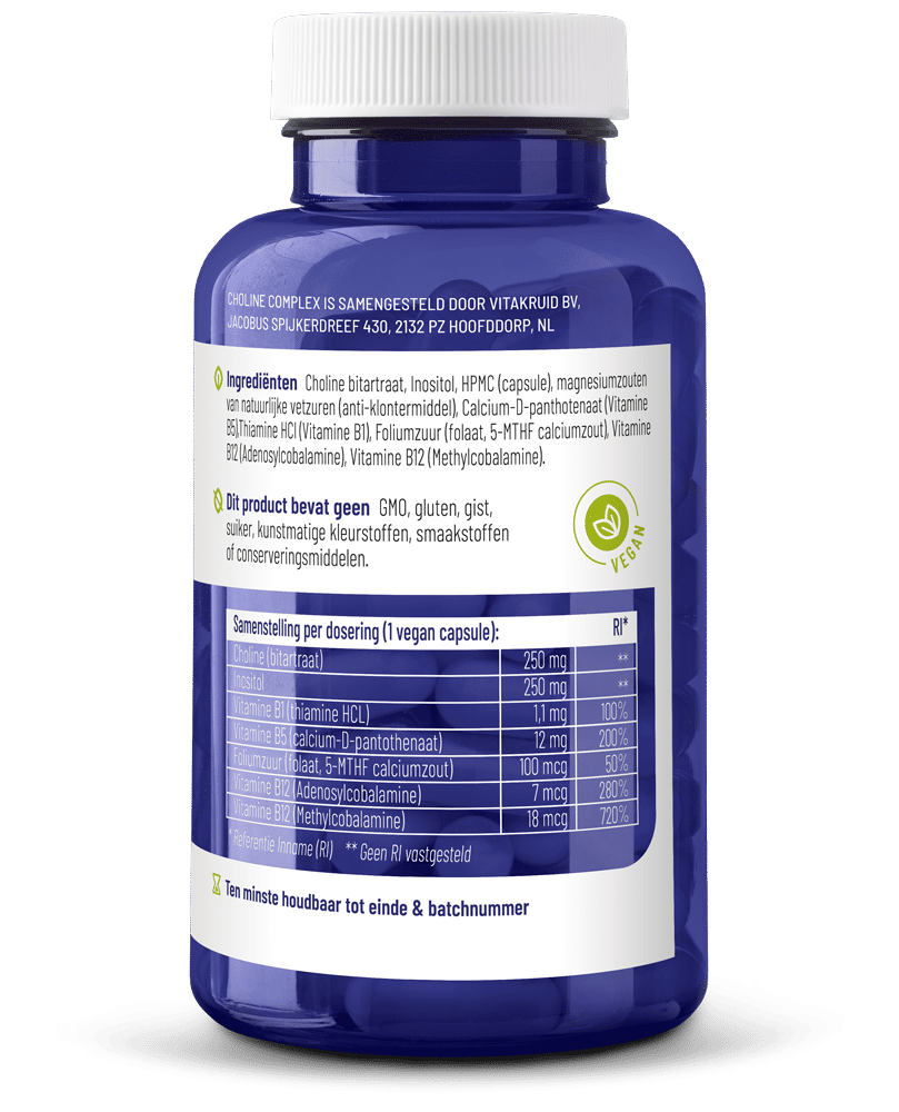 Choline Complex bevat naast choline zelf ook andere nutriënten in de actieve en biologisch beschikbare vorm. Zo bestaat het complex uit de natuurlijke vormen van vitamine B12: methylcobalamine en adenosylcobalamine, deze worden beter opgenomen door het lichaam dan de synthetische varianten. Daarnaast vind je in het complex de bioactieve vorm van foliumzuur: 5-MTHF (5-methyltetrahydrofolaat). Deze vorm is direct beschikbaar voor de biologische processen in het lichaam, zonder een extra omzettingsstap te hoeven ondergaan.