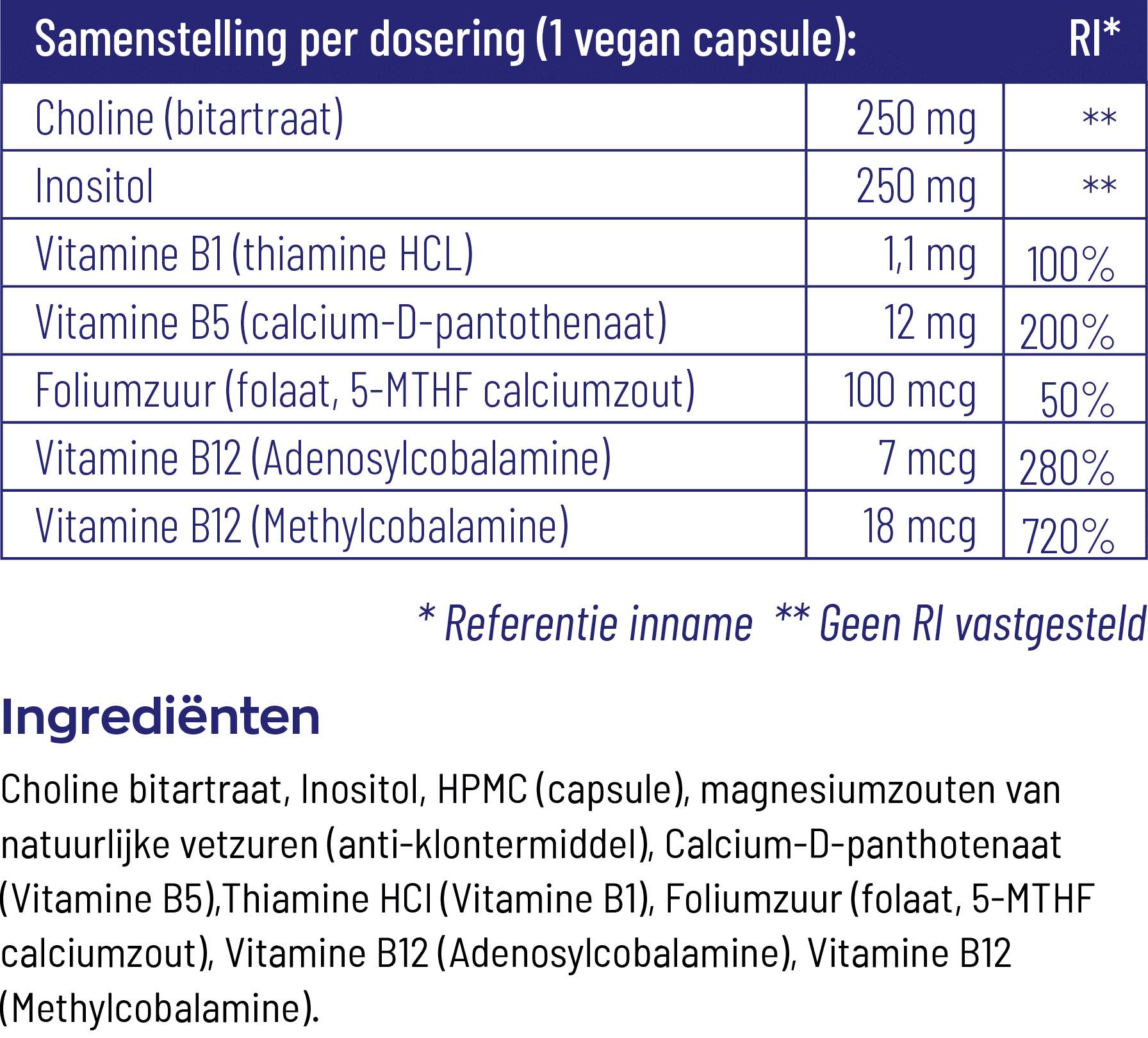 Choline bitartraat, Inositol, HPMC (capsule), magnesiumzouten van natuurlijke vetzuren (anti-klontermiddel), Calcium-D-panthotenaat (Vitamine B5), Thiamine HCL (Vitamine B1), Foliumzuur (folaat, 5-MTHF calciumzout), Vitamine B12 (Adenosylcobalamine), Vitamine B12 (Methylcobalamine).