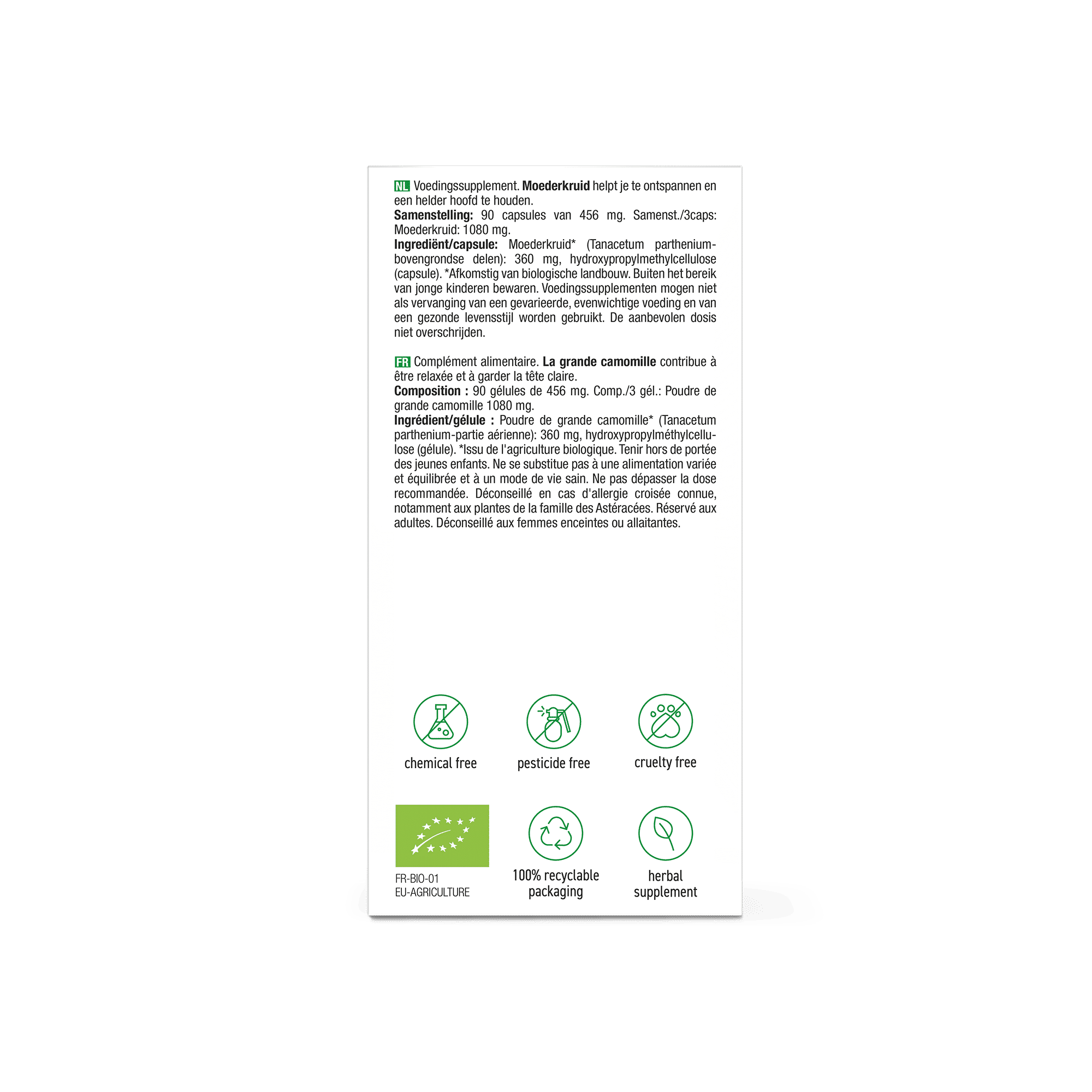 Moederkruid* (Tanacetum partheniumbovengrondse delen), hydroxypropylmethylcellulose (capsule).