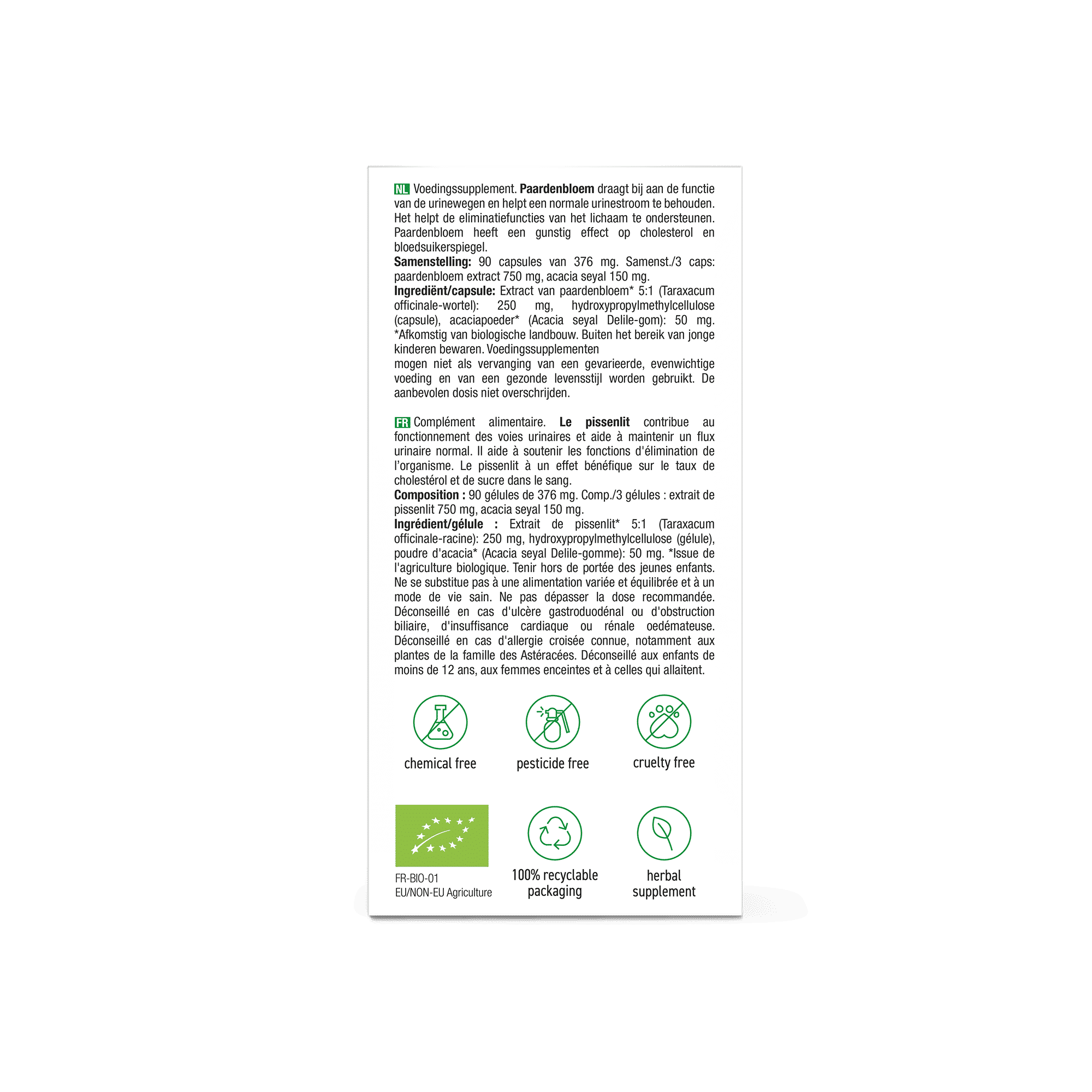Extract van paardenbloem* 5:1 (Taraxacum officinale-wortel), hydroxypropylmethylcellulose (capsule), acaciapoeder* (Acacia seyal Delile-gom).