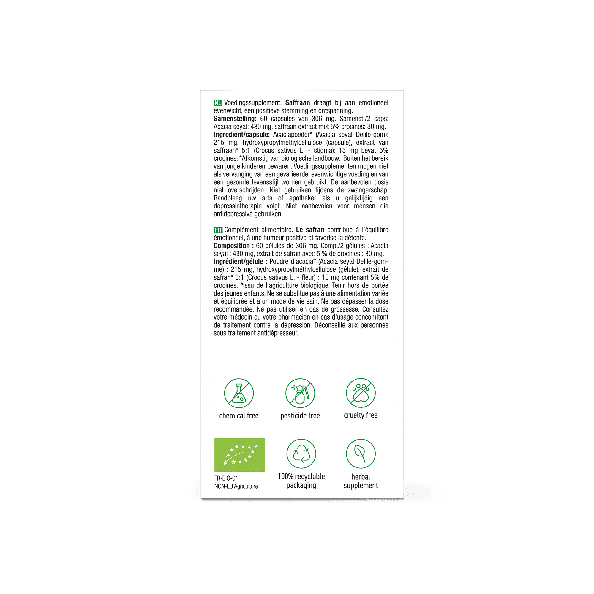 Acaciapoeder* (Acacia seyal Delile-gom), hydroxypropylmethylcellulose (capsule), extract van saffraan* 5:1 (Crocus sativus L. - stigma).