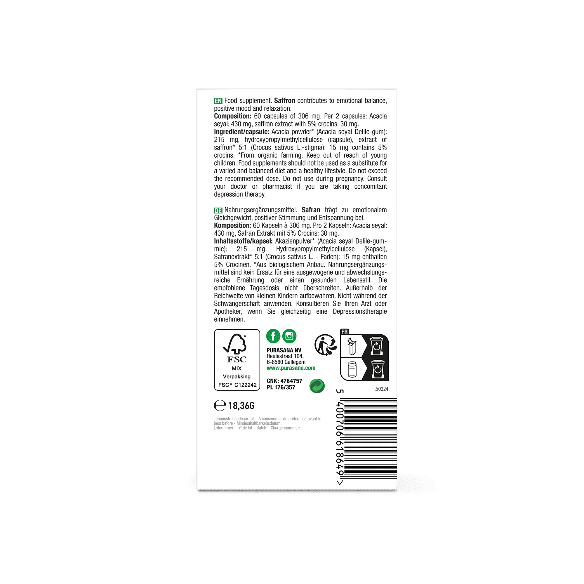 | Extract van saffraan 5:1 (Crocus sativus L. - stigma) | 30 mg (bevat 5% crocines) |
