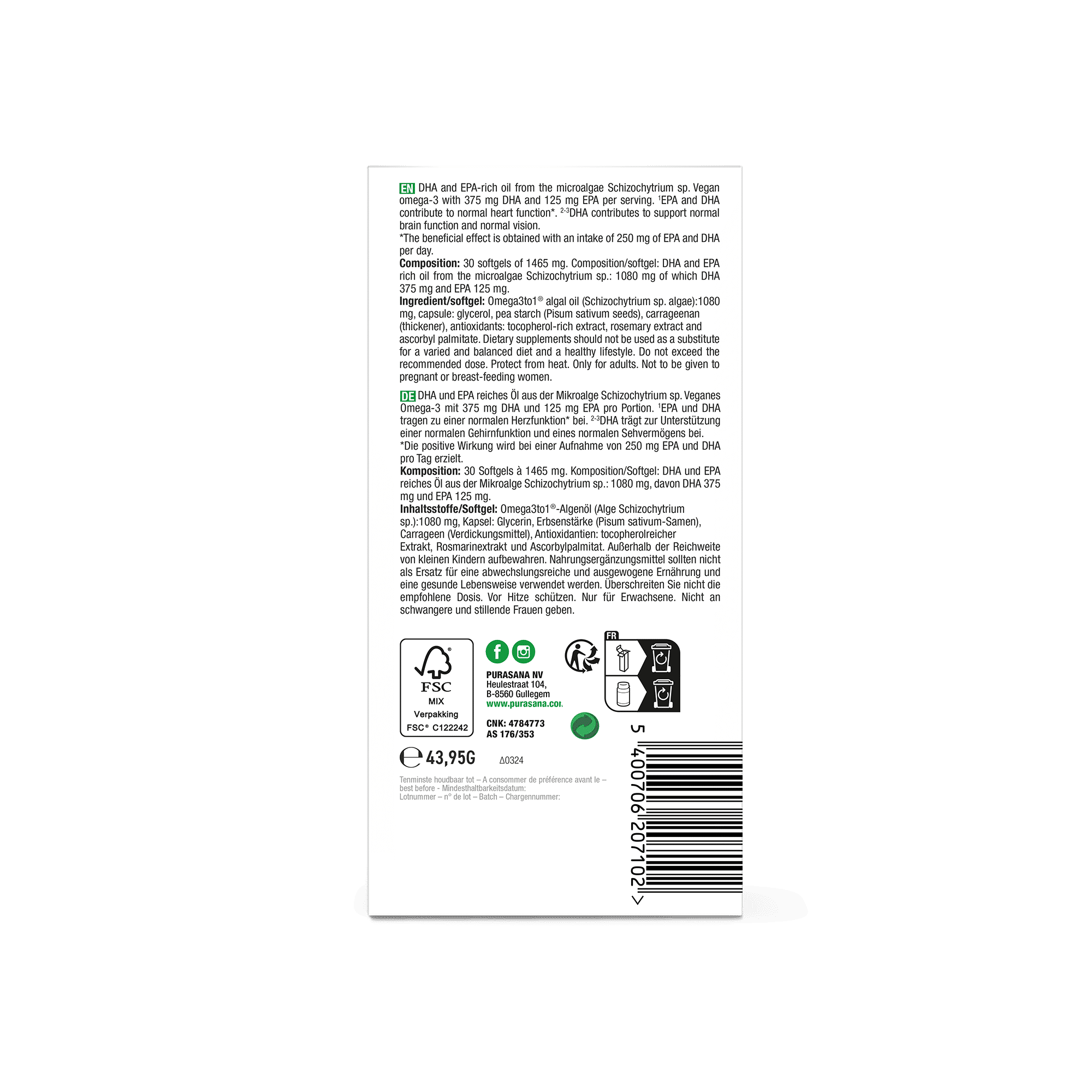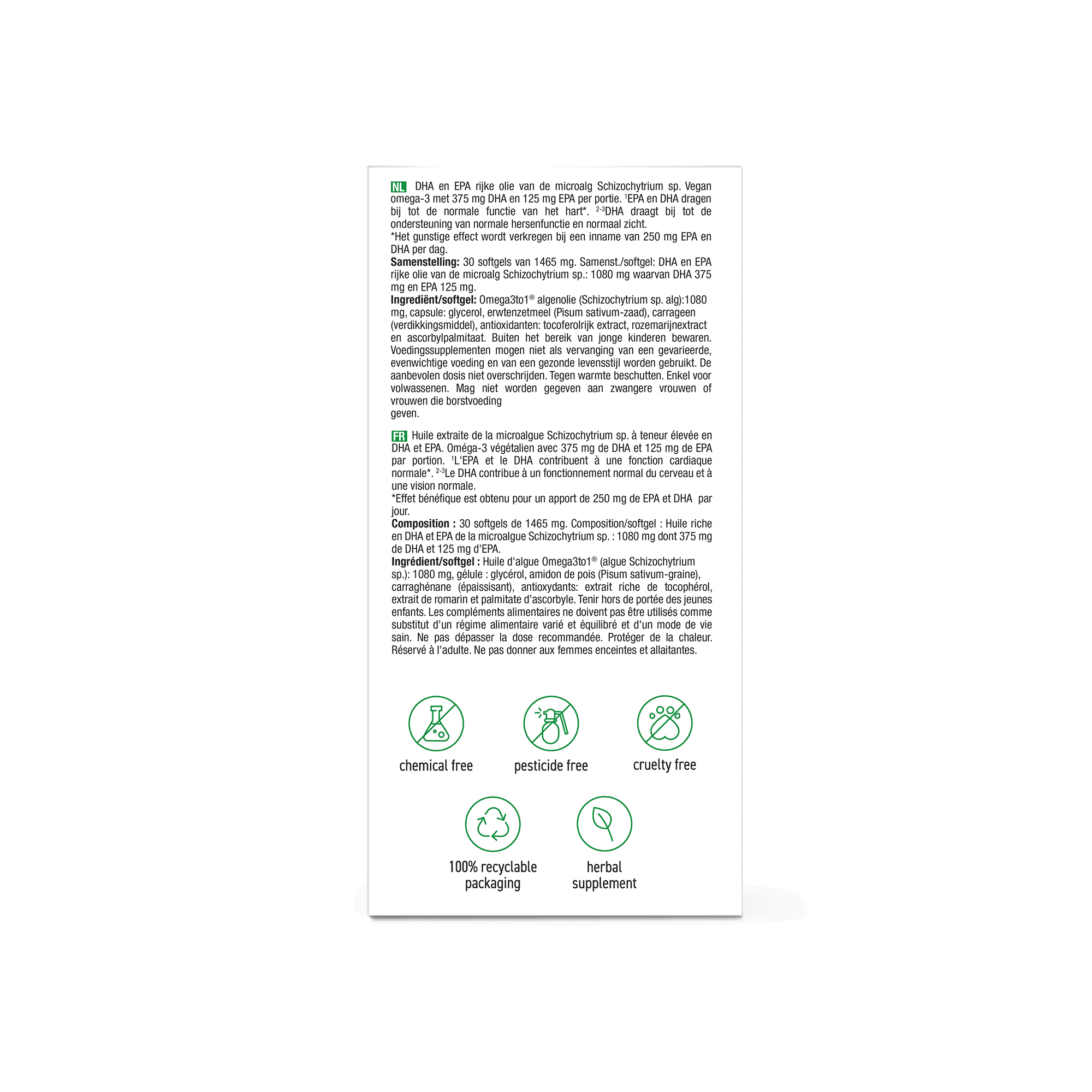 Omega 3 to 1 algenolie (Schizochytrium sp. alg), capsule: glycerol, erwtenzetmeel (Pisum sativum-zaad), carrageen (verdikkingsmiddel), antioxidanten: tocoferolrijk extract, rozemarijnextract en ascorbylpalmitaat.