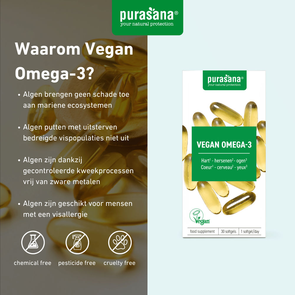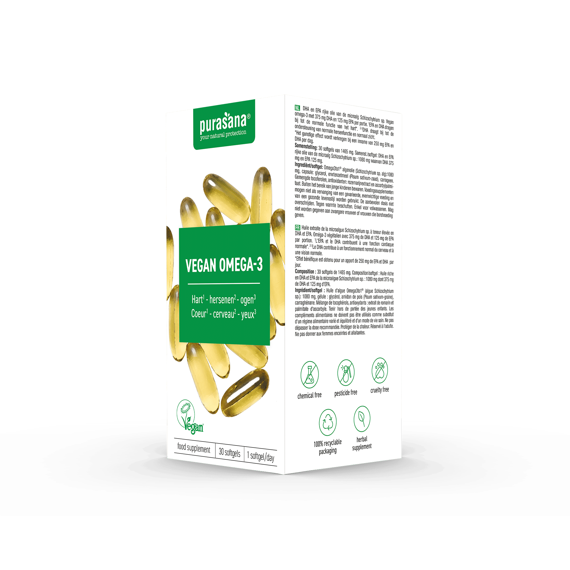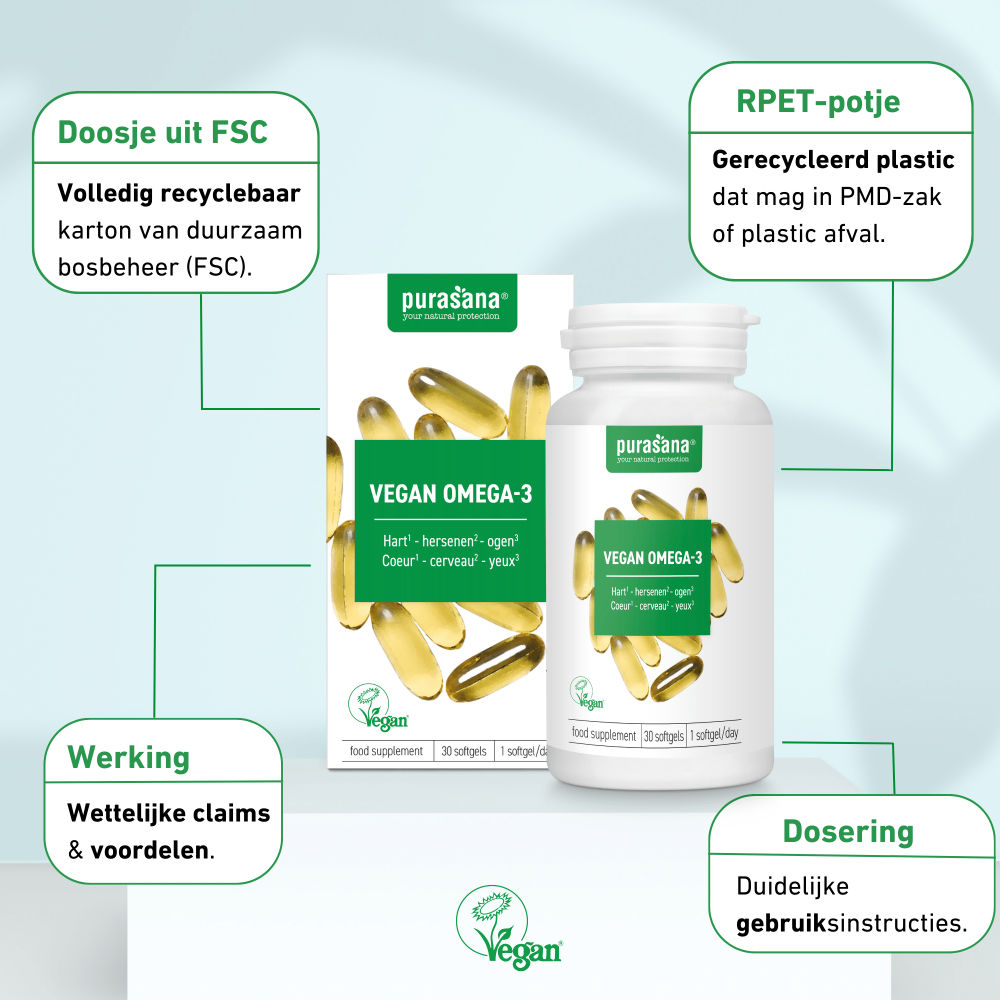 Purasana's vegan omega-3 softgels zijn een diervriendelijke en duurzame bron van omega-3 vetzuren. Het gebruik van de algensoort Schizochytrium in plaats van vis zorgt voor een omega-3 optie vrij van de milieu-impact die traditionele visolie met zich meebrengt.
