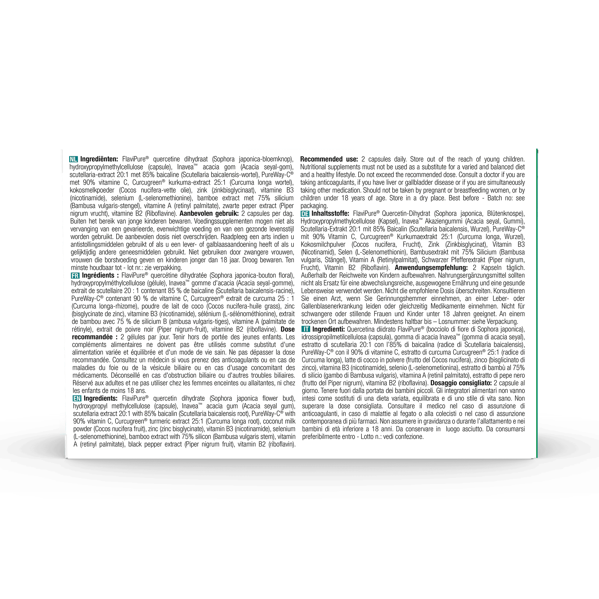 FlaviPure® quercetinedihydraat (Sophora japonica-bloemknop), hydroxypropylmethylcellulose (capsule), Inavea™ acacia gom (Acacia seyal-gom), scutellaria-extract 20:1 met 85% baicaline (Scutellaria baicalensis-wortel), PureWay-C® met 90% vitamine C, Curcugreen® kurkuma extract 25:1 (Curcuma longa wortel), kokosmelkpoeder (Cocos nucifera-vette olie), zink (zinkbisglycinaat), vitamine B3 (nicotinamide), selenium (L-selenomethionine), bamboe extract met 75% silicium (Bambusa vulgaris-stengel), vitamine A (retinylpalmitaat), zwarte peperextract (Piper nigrum vrucht), vitamine B2 (Riboflavine).