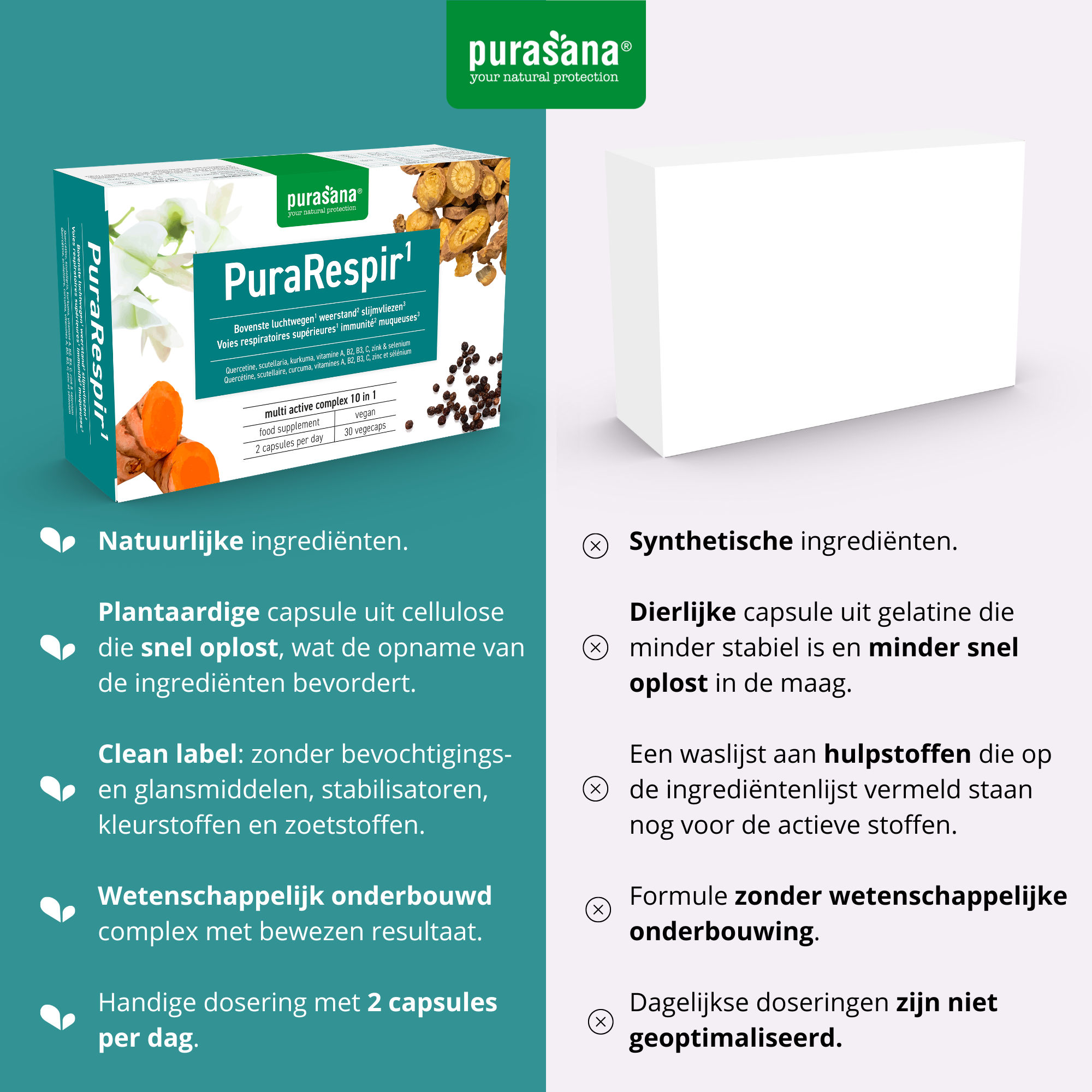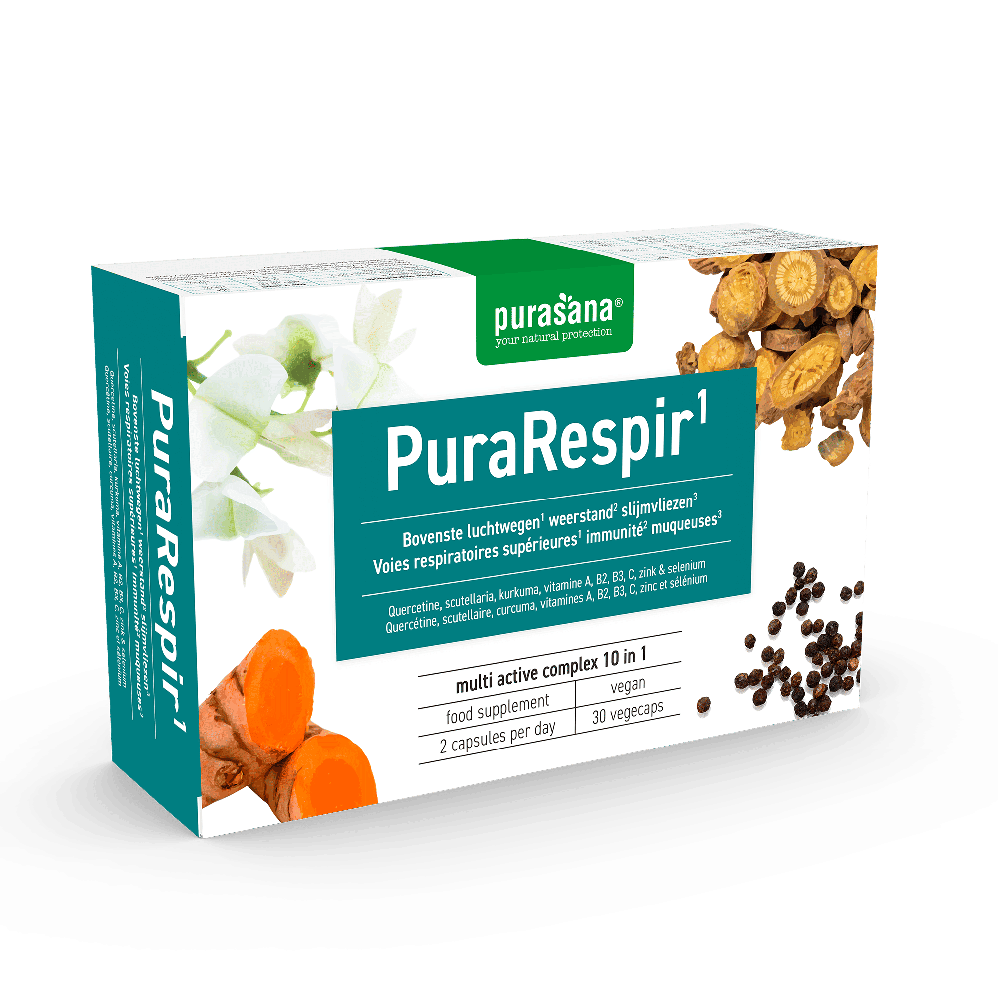 PuraRespir is een 10-in-1 nutraceutical supplement dat bijdraagt tot normale slijmvliezen, luchtwegen en weerstand dankzij ingrediënten zoals scutellaria, quercetine, kurkuma* en vitamine A.