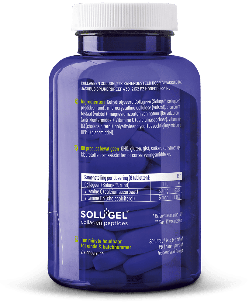 Gehydrolyseerd Collageen (Solugel® collageen peptides, rund), microcrystalline cellulose (vulstof), dicalcium fosfaat (vulstof), magnesiumzouten van natuurlijke vetzuren (anti-klontermiddel), Vitamine C (calciumascorbaat), Vitamine D3 (cholecalciferol), polyethyleenglycol (bevochtigingsmiddel), HPMC (glansmiddel).
