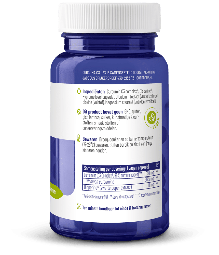 - Curcuma C3-2X is 20 x beter opneembaar door aanwezigheid en combinatie van gepatenteerde Bioperine™ en Curcumin C3 Complex™