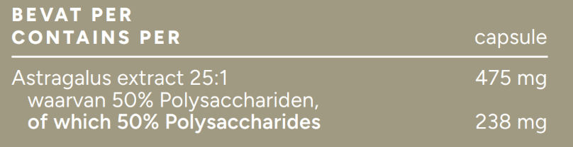 Astragalus (Astragalus membranaceus, wortel), HPMC maagrzuurresistente vegetarische capsule (huls).