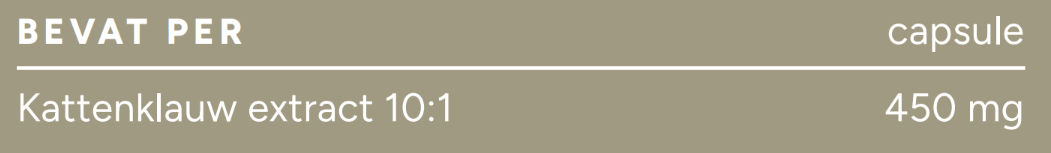 Kattenklauw extract (Uncaria tomentosa, binnenkant schors), HPMC maagzuurresistente vegetarische capsule (huls).