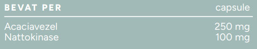 Acaciavezel, Nattokinase poeder (extract van gefermenteerde SOJAbonen (Glycine max.) (Fermokinase™)), HPMC vegetarische capsule (huls).