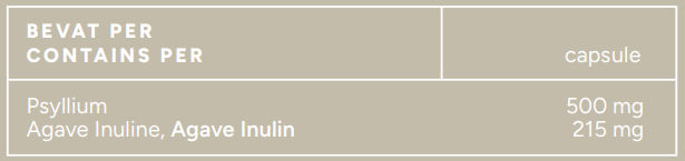 70% Psyllium husk (Plantago ovata) poeder*, 30% Inuline (van Agave plant)*, HPMC vegetarische capsule (huls).