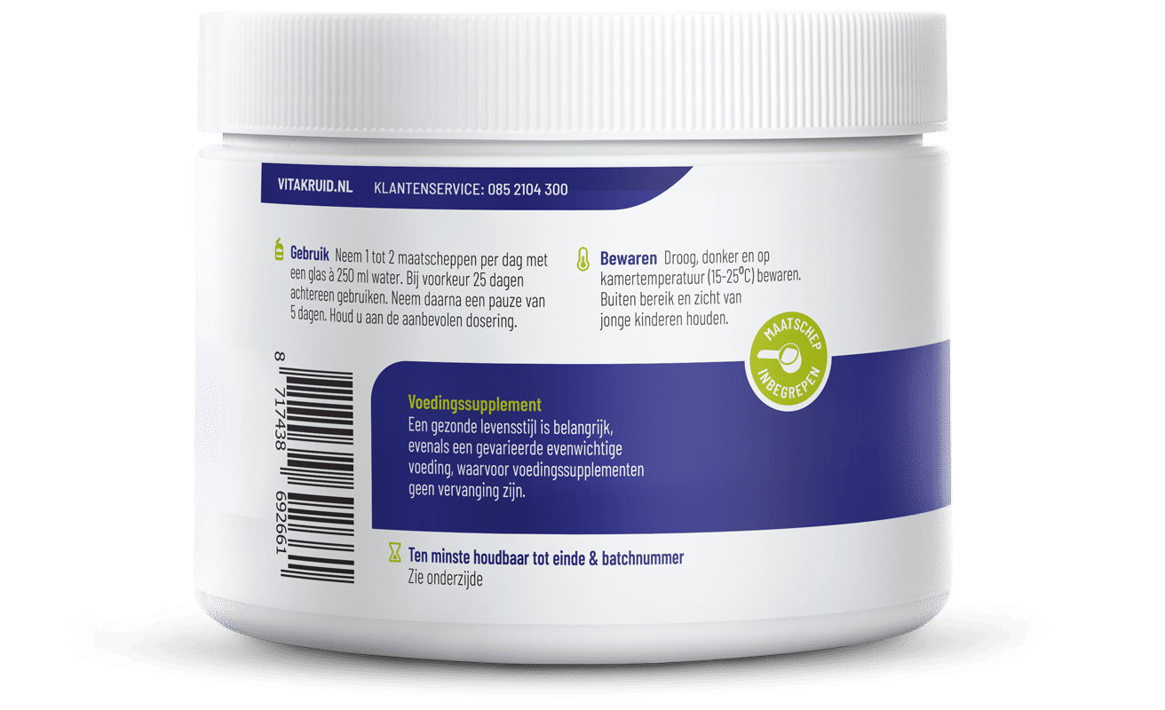 Neem 1 tot 2 maatscheppen per dag met een glas à 250 ml water. Goed oplosbaar in o.a. (lauw)warm water, koffie, thee, vruchtensap, chocomel, soep, eiwitshake, havermout, smoothies, yoghurt en kwark. Na het roeren 5 minuten laten staan voor optimale oplossing.