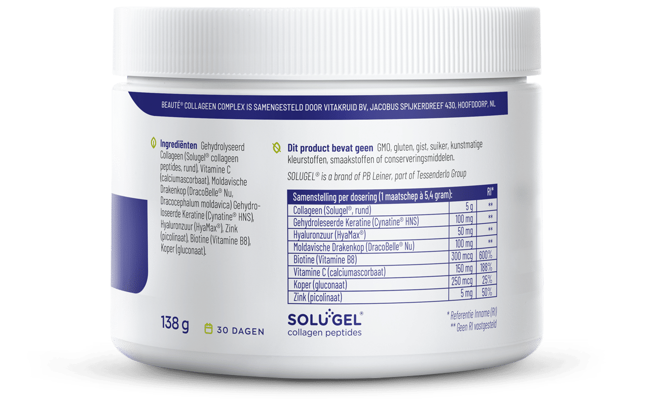 In Beauté® Collageen Complex hebben we gekozen voor collageen van Solugel®, de koploper op collageengebied. Zo is deze collageen uiterst zuiver, goed opneembaar en klinisch getest.