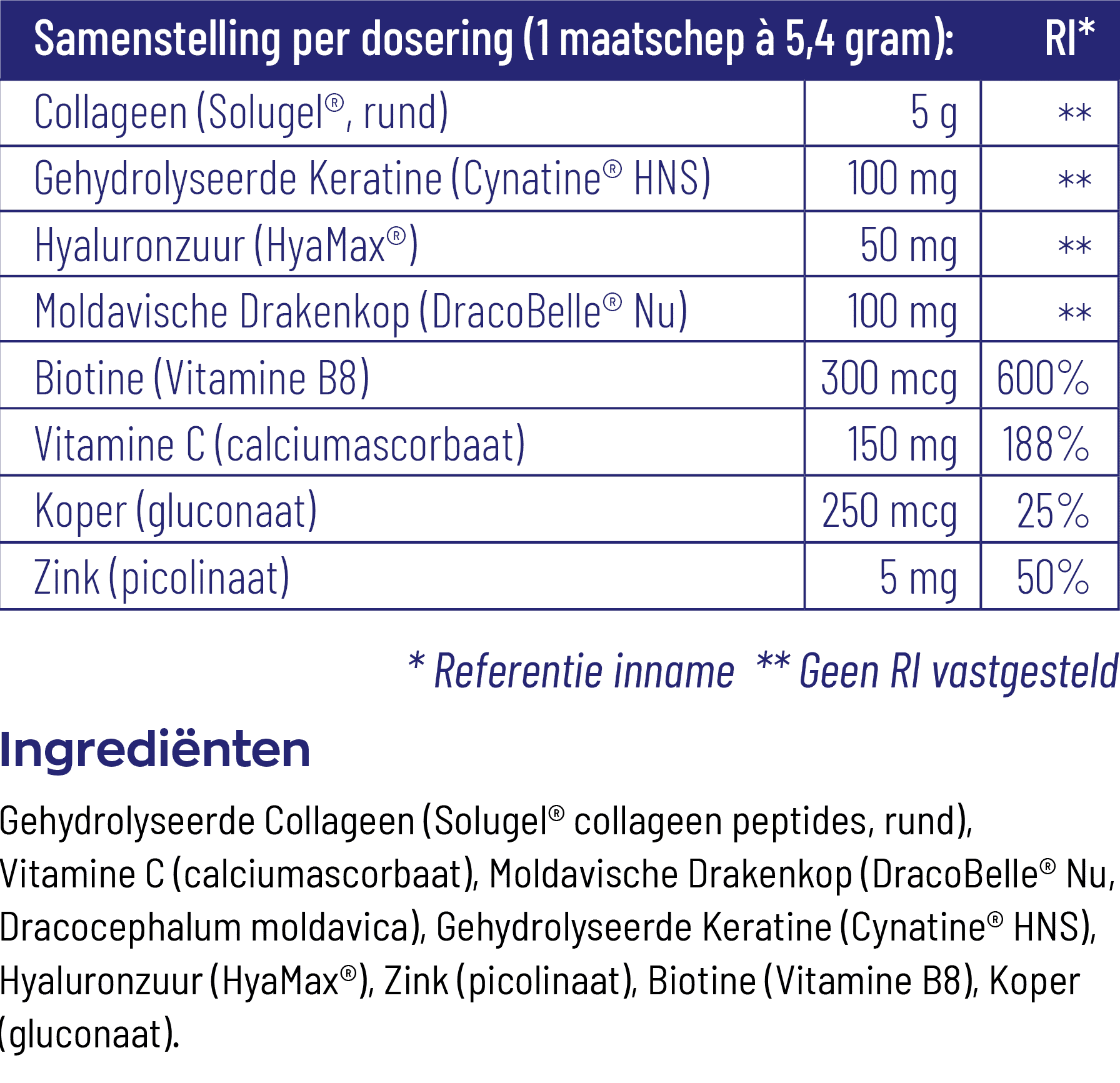 Gehydrolyseerd Collageen (Solugel® collageen peptides, rund), Vitamine C (calciumascorbaat), Moldavische Drakenkop (DracoBelle® Nu, Dracocephalum moldavica) Gehydroliseerde Keratine (Cynatine® HNS), Hyaluronzuur (HyaMax®), Zink (picolinaat), Biotine (Vitamine B8), Koper (gluconaat).