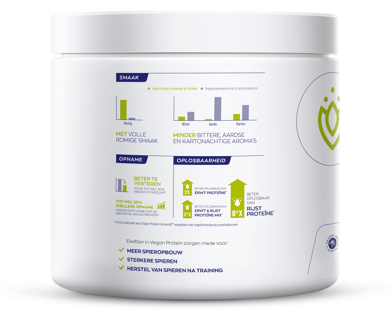 Vegan Protein onderscheidt zich door FermentIQ™. Met deze unieke technologie worden erwten- en rijstproteïnen gefermenteerd met de shiitake paddenstoel. Dit resulteert in een betere smaak, verhoogde opname en verbeterde oplosbaarheid.
