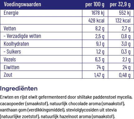 Erwten en rijst eiwit gefermenteerd door shiitake paddenstoel mycelia, cacaopoeder (smaakstof), natuurlijk chocolade aroma (smaakstof), xanthaan gom (verdikkingsmiddel), steviolglycosiden uit stevia (natuurlijke zoetstof), natuurlijk hazelnoot aroma (smaakstof)