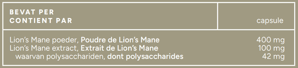 Biologisch Lion’s Mane (Pruikzwam, Hericium erinaceus) poeder (fruiting body), Biologisch Lion’sMane (Pruikzwam, Hericium erinaceus) heet-water extract (fruiting body), HPMC vegetarische capsule (huls). Bevat van nature SULFIET.