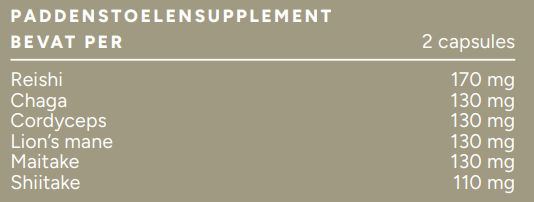 Reishi poeder (Ganoderma lucidum, vruchtlichaam)*, Chaga extract 10:1 (Inonotus obliquus, vruchtlichaam)*, Cordyceps (Cordyceps sinensis, fullspectrum mycelium biomassa)*, Lion’s Mane heet-water extract (Hericium erinaceus, vruchtlichaam)*, Maitake 12:1 extract (Grifola frondosa, vruchtlichaam)*, Shiitake 11:1 extract (Lentinula edodes, vruchtlichaam), HPMC vegetarische capsule (huls).