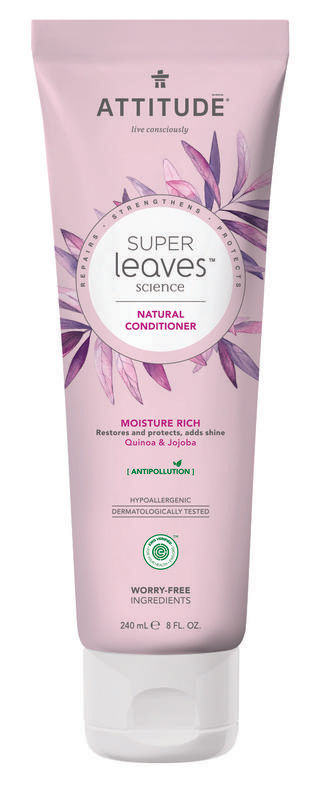 Met een aroma dat ons doet denken aan guave en bessen, is ATTITUDE's Super leaves™ Vochtrijke conditioner verrijkt met quinoa en jojoba-proteïnen om het haar te helpen voeden, hydrateren, herstellen, beschermen en glans toe te voegen. Ideaal dus voor doffe, droge en broze lokken. Onze Vochtrijke conditioner die dermatologisch getest is, bevat extract uit moringazaad, bekend om zijn reinigende eigenschappen. Voor optimale hydratatieresultaten, samen gebruiken met onze Vochtrijke shampoo vóór het aanbrengen van de conditioner. Voor mooi haar, van wortel tot punt!
