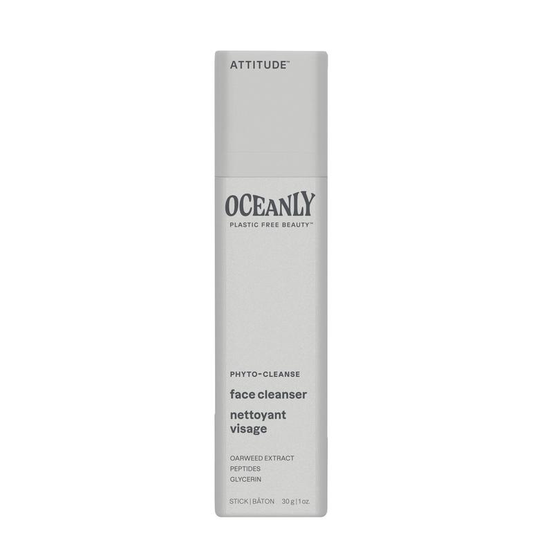 PHYTO-CLEANSE vaste gezichtsreiniger uit de plasticvrije ATTITUDE-lijn van Oceanly is geurvrij, wordt geleverd in een biologisch afbreekbare papieren kokerverpakking uit duurzaam beheerde bossen en is net zo zacht voor de huid als voor het milieu.