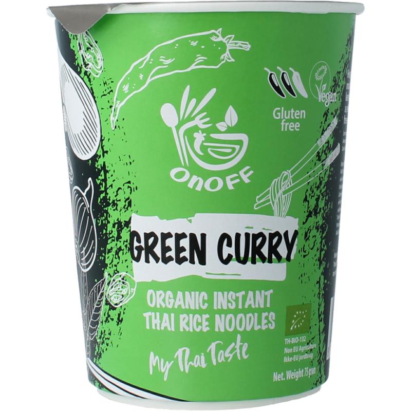Biologische instant thaise rijst noodlesoep gemaakt met groene chilipepers en citroengras. Het ruikt heerlijk en is kruidig, maar met een zoete basis.
