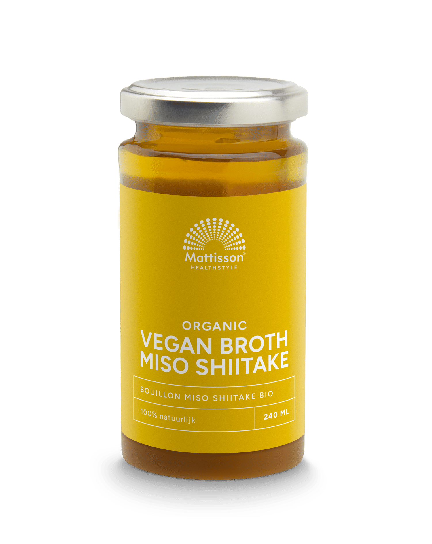 Miso shiitake bouillon wordt gemaakt van miso, een Japanse smaakmaker die bestaat uit een een gefermenteerd mengsel van sojabonen, koji (een schimmel) en shiitake. Shiitake is een eetbare paddenstoel die veel gegeten wordt in Oost Aziatische landen en enorm gewaardeerd wordt vanwege zijn heerlijke umami smaak en unieke voedingsprofiel. De voedingsstoffen uit de paddenstoelen, miso en andere toegevoegde kruiden komen volledig vrij na een inkookproces variërend van 30 tot maar liefst 72 uur.