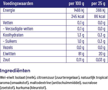 Wei-eiwit Isolaat (MELK), citroenzuur (zuurteregelaar), natuurlijk tropical aroma (smaakstof), maltodextrine (antischuimmiddel), sucralose (zoetstof), kurkuma (kleurstof).