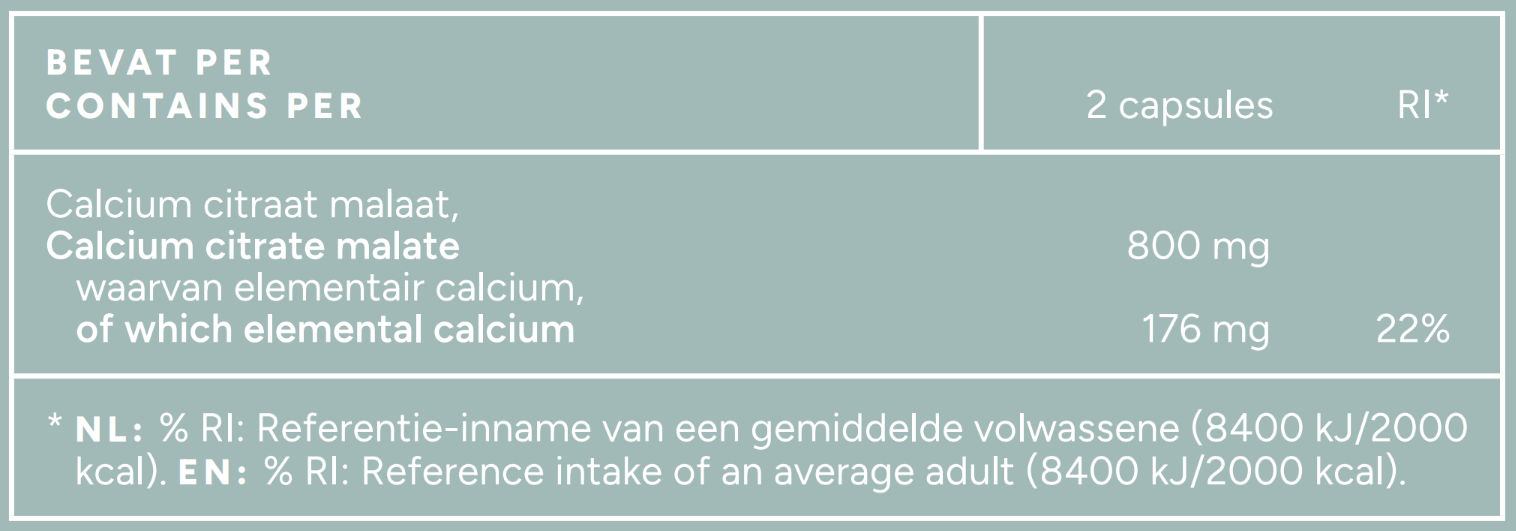 Elementair calcium verwijst naar de zuivere, ongebonden vorm van het mineraal calcium. Dit is het calcium dat direct beschikbaar is voor opname in het lichaam en dat wordt gebruikt in voedingssupplementen en medicijnen. In het geval van deze capsules is het elementaire gehalte calcium bij inname van 2 capsule, 174 mg. Dit staat gelijk aan 22 % van de aanbevolen dagelijkse hoeveelheid aan calcium.