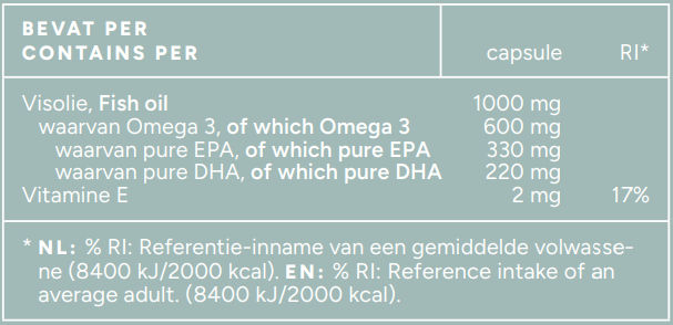 VISolie (Peruaanse ansjovis), gelatine (rund) en glycerine (softgel), Vitamine E.