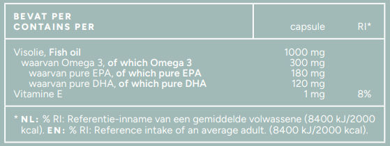VISolie (Peruaanse ansjovis), gelatine (rund) en glycerine (softgel), Vitamine E.