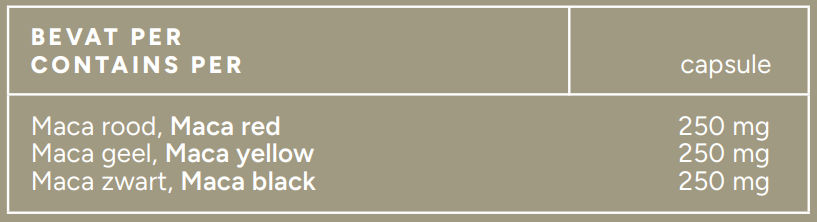 Maca rood (Lepidium meyenii)*, Maca geel (Lepidium meyenii)*, Maca zwart (Lepidium meyenii)*, HPMC vegetarisch capsule (huls).