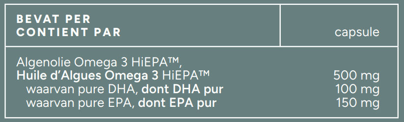 Algenolie Omega 3 HiEPA™ (DHA en EPA- rijke olie van de microalg Schizochytrium sp.), vegetarische huls (gemodificeerd erwtenzetmeel, glycerol (bevochtigingsmiddel), carrageen (verdikkingsmiddel), antioxidanten (tocoferolrijke extracten).