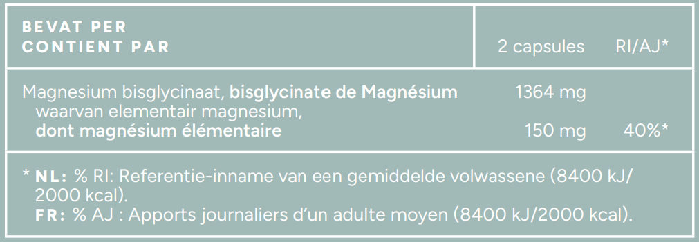 Mattisson magnesium bisglycinaat capsules bevatten per twee capsules 150 mg elementair magnesium (40% adh).