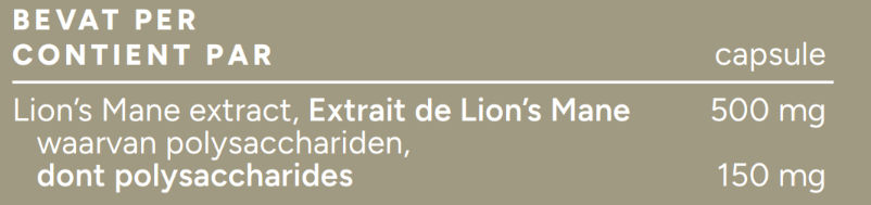 Biologisch Lion’s Mane (Pruik-zwam, Hericium erinaceus, vruchtlichaam) 10:1 heet-water extract, HPMC vegetarische capsule (huls). Bevat van nature SULFIET.