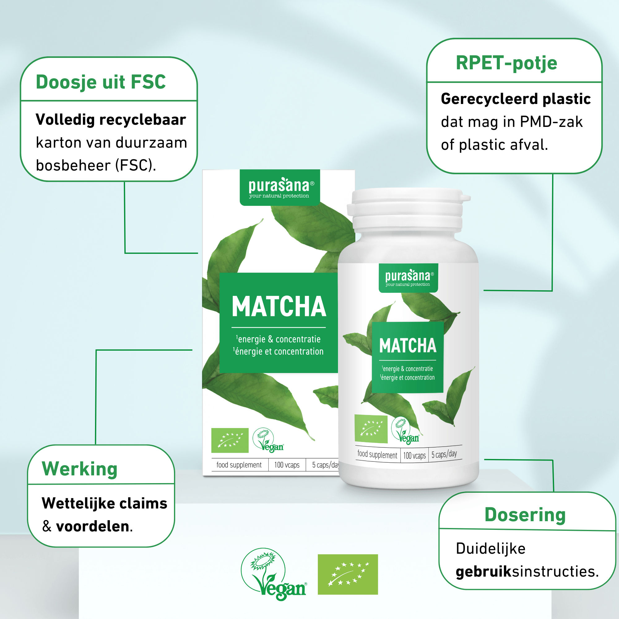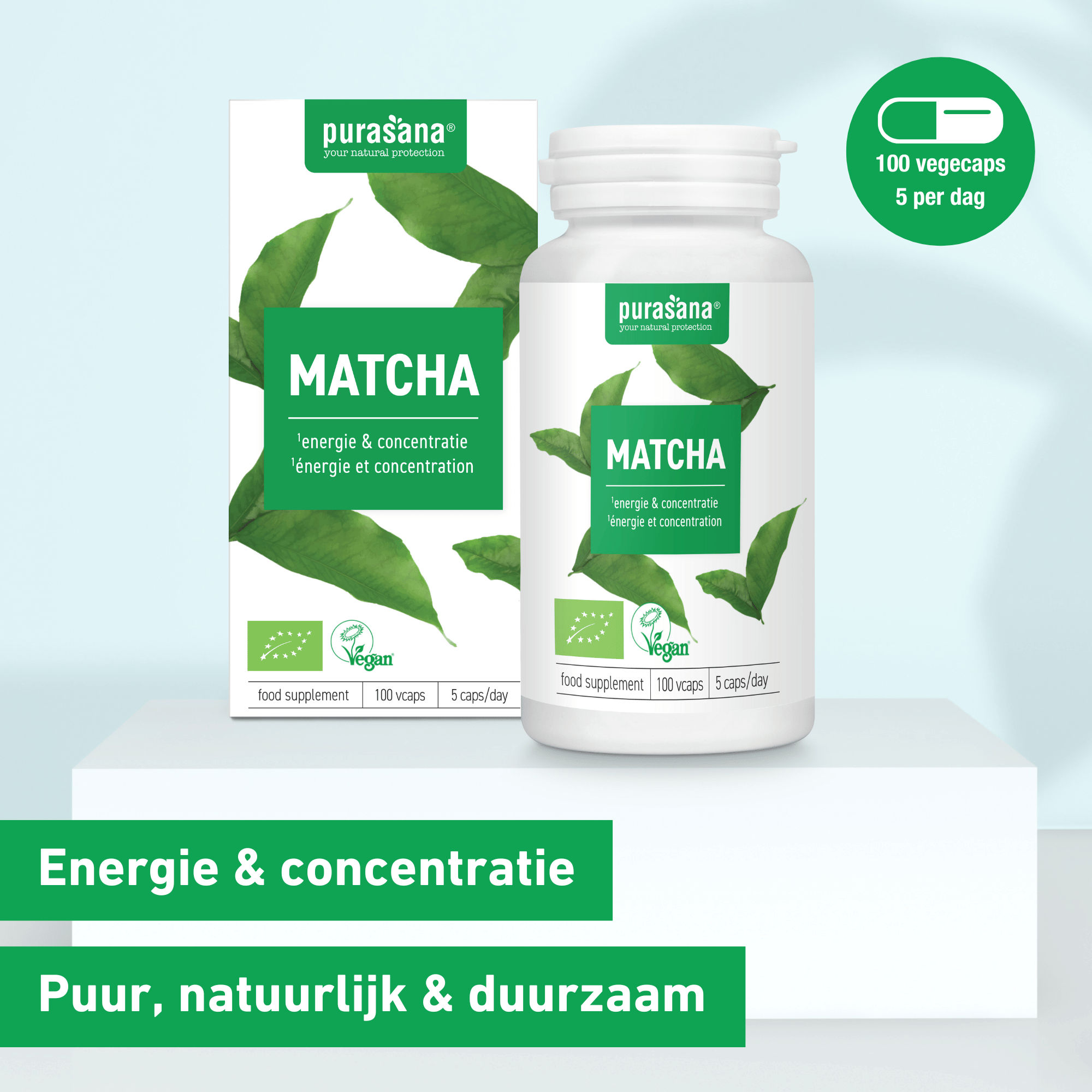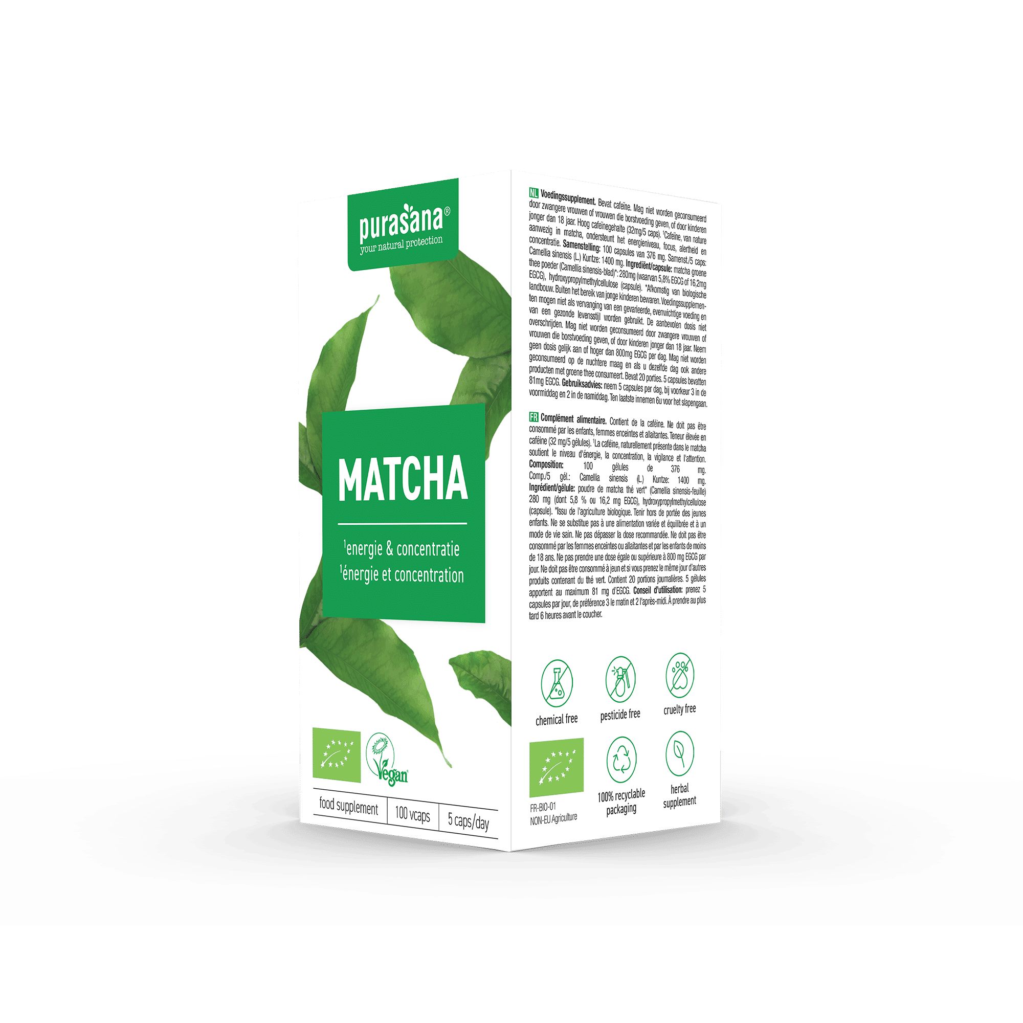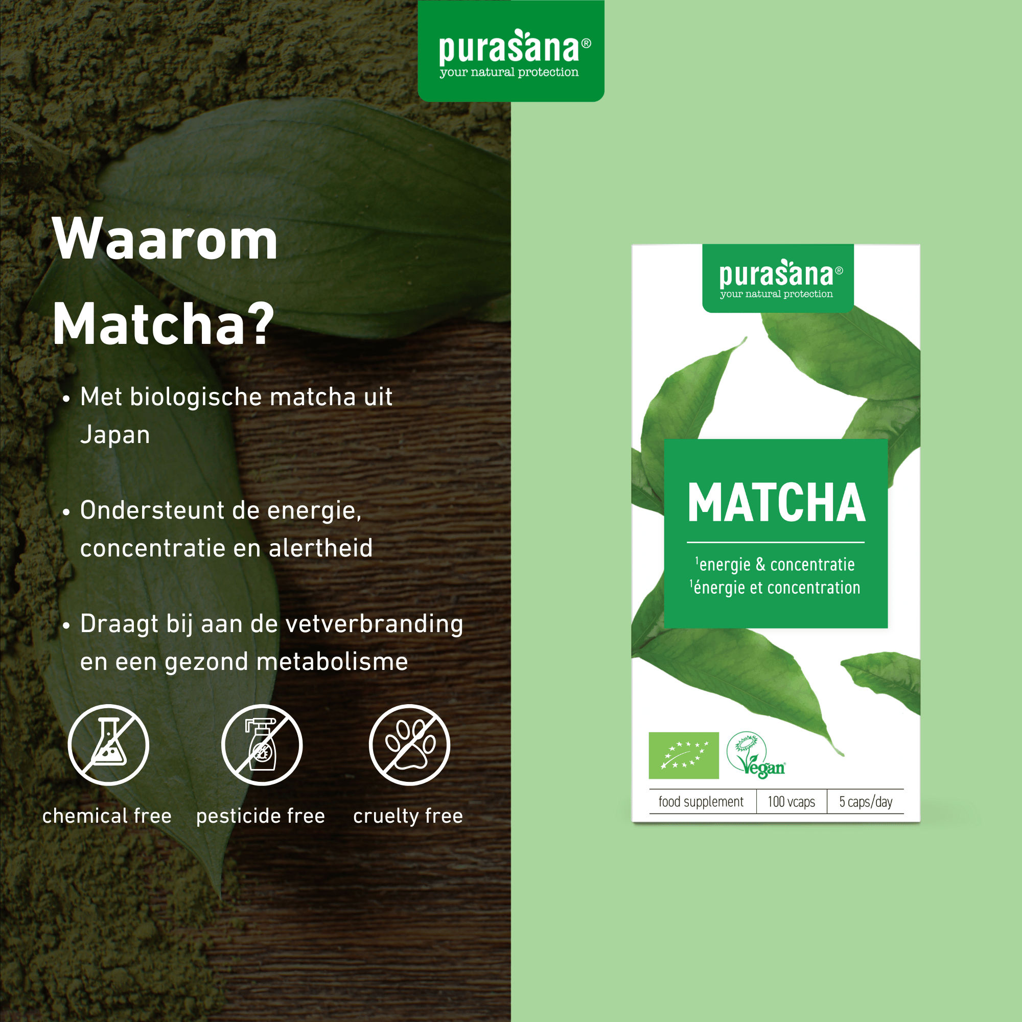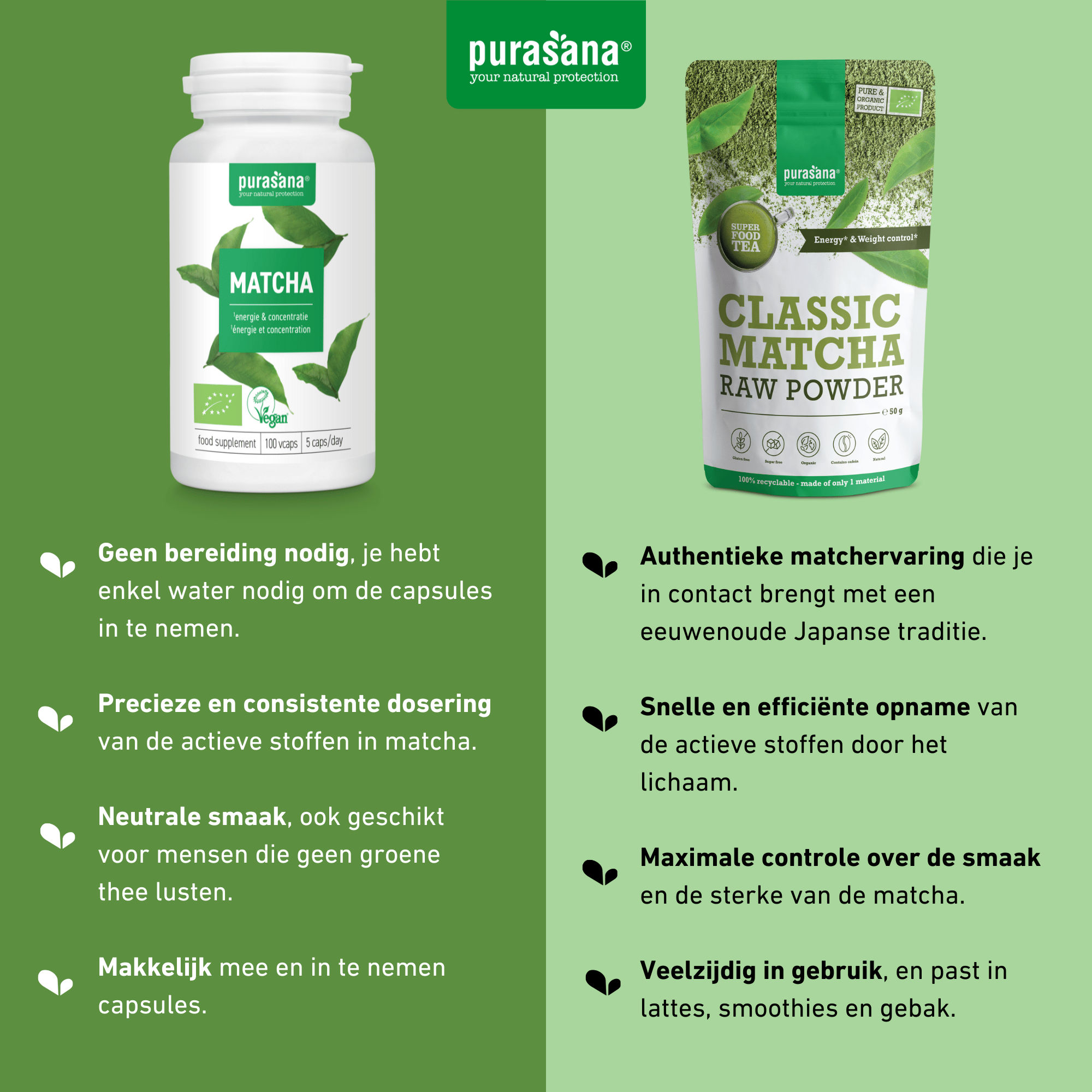 Purasana Matcha Capsules (100 stuks) bevatten hoogwaardig matcha poeder uit Japan en bieden alle voordelen van deze verfijnde groene thee in een handige capsulevorm. Het poeder dat in de capsules zit, is hetzelfde hoogwaardige matcha dat ook in onze Classic Matcha te vinden is. Matcha staat bekend om zijn rijke samenstelling van werkzame stoffen, waaronder cafeïne, EGCG en chlorofyl.