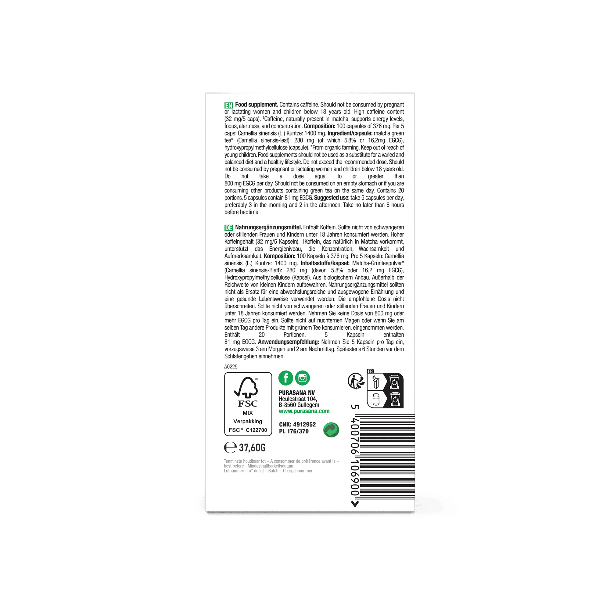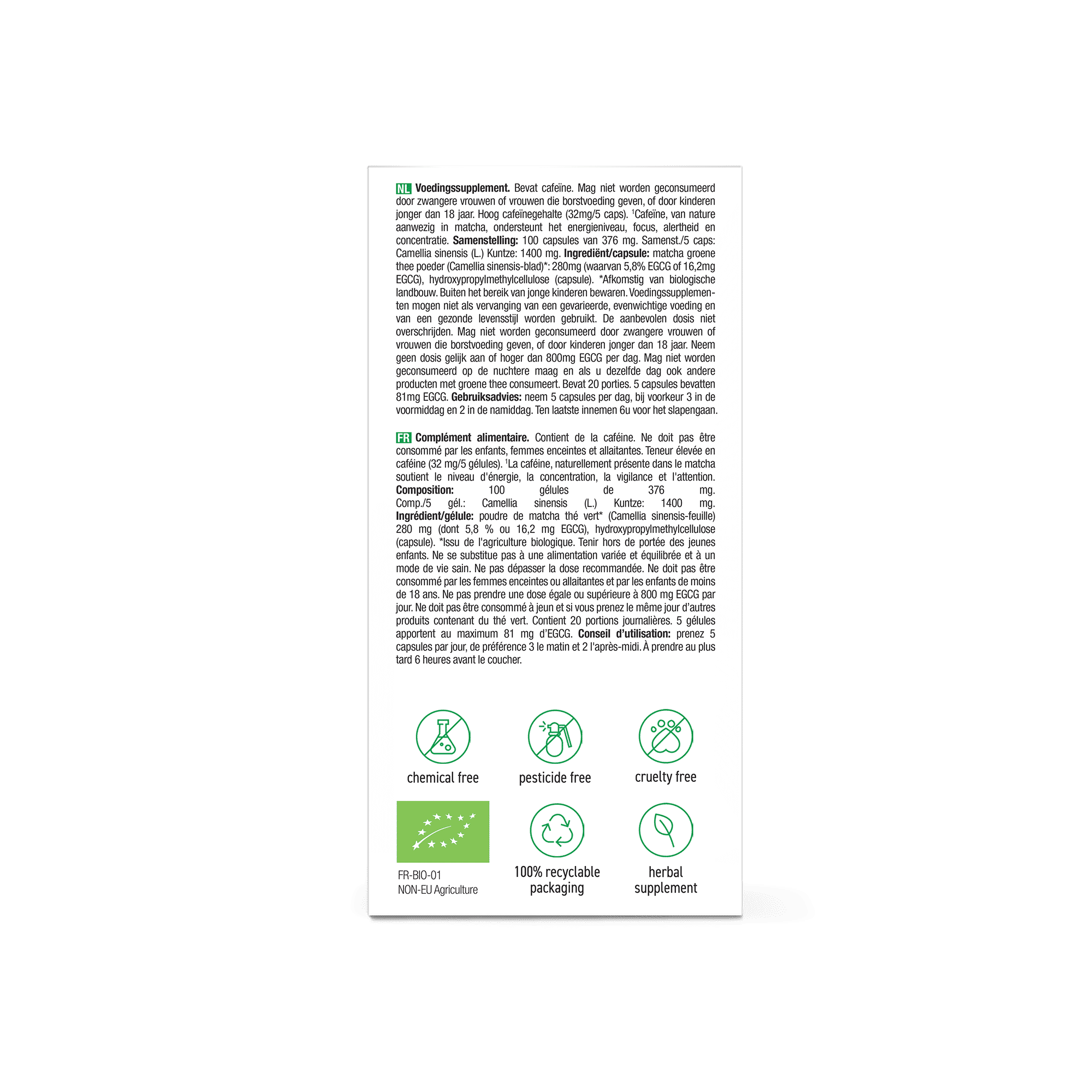 Matcha groene theepoeder (Camellia sinensis-blad)* (waarvan 5,8% EGCG), hydroxypropylmethylcellulose (capsule).