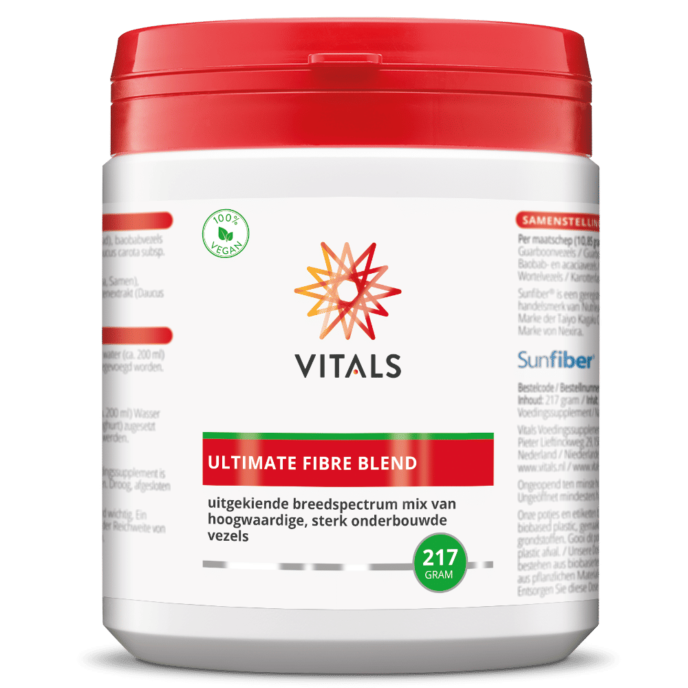 Ultimate Fibre Blend van Vitals is een unieke mix van vier plantaardige vezels met een sterke wetenschappelijke onderbouwing. Het bevat allereerst een mooie Nederlandse innovatie genaamd Benicaros®. Dit bestaat uit een vezel uit wortel met een unieke structuur. Daarnaast is uiteraard Sunfiber® toegevoegd, de inmiddels welbekende en zeer geliefde guarboonvezels met eigen unieke voordelen. De mix wordt aangevuld met Inavea™, een combinatie van oplosbare vezels uit de gom van de acaciaboom en het vrucht van de baobab, twee Afrikaanse bomen met een rijke voedingswaarde. Samen vormen deze vier vezels een breed en veelzijdig vezelcomplex. Niet voor niets noemen we het de Ultimate Fibre Blend.