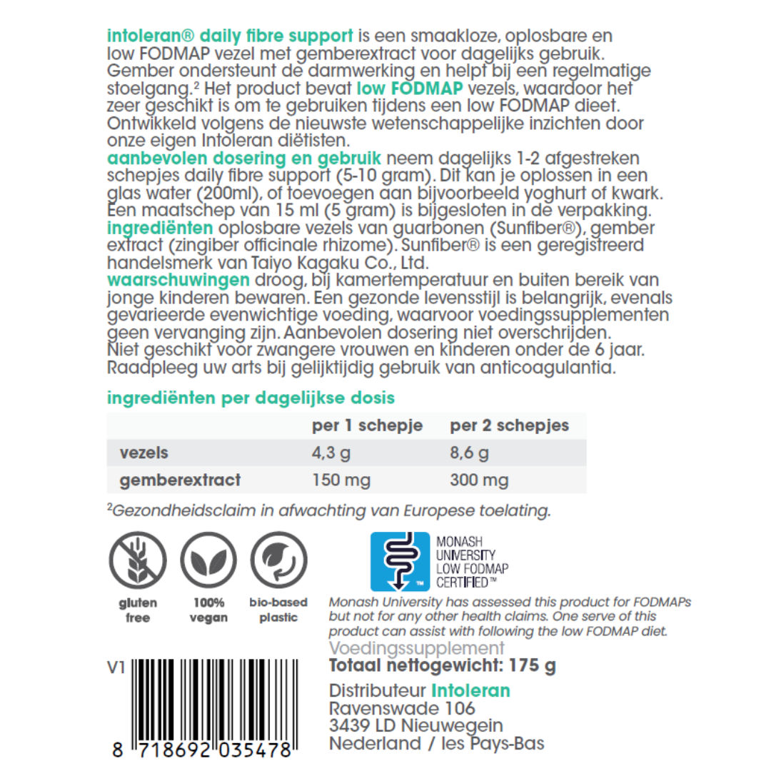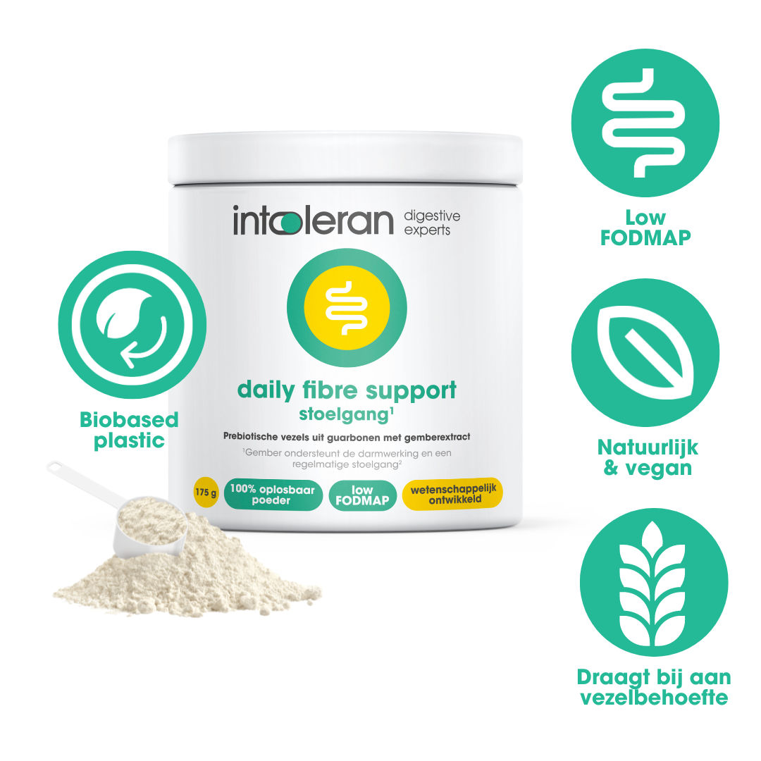Intoleran Daily Fibre Support bestaat uit prebiotische vezels van de guarboon gecombineerd met gemberextract.