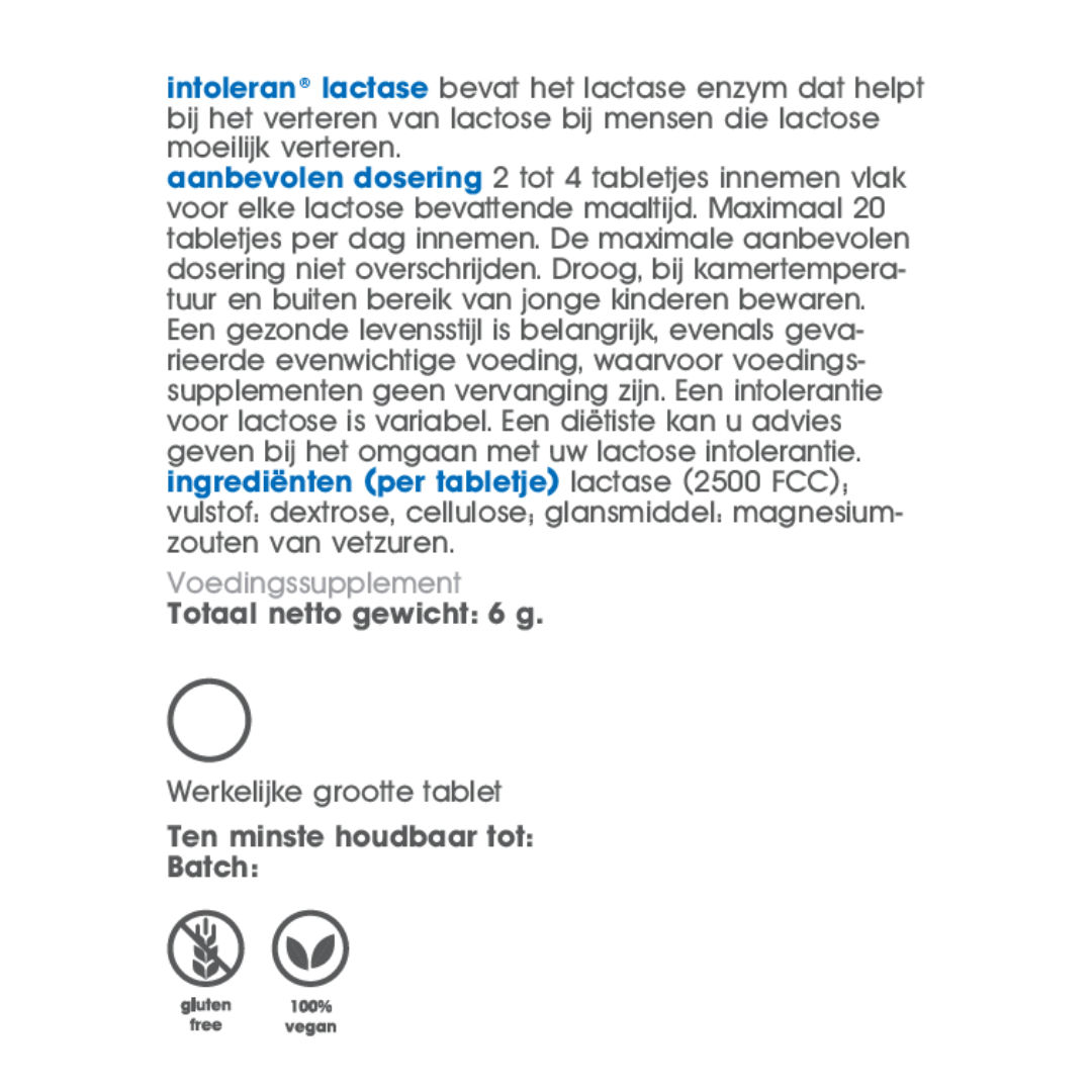Vlak voor elke lactose bevattende maaltijd 1 tot 4 tabletjes innemen om de lactose uit die maaltijd te kunnen verteren. Maximaal 20 tabletten per dag gebruiken. Voor mensen met een lichte lactose intolerantie en om kleinere hoeveelheden lactose per maaltijd te kunnen verteren.