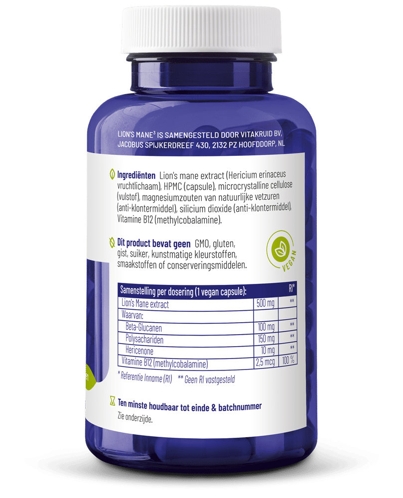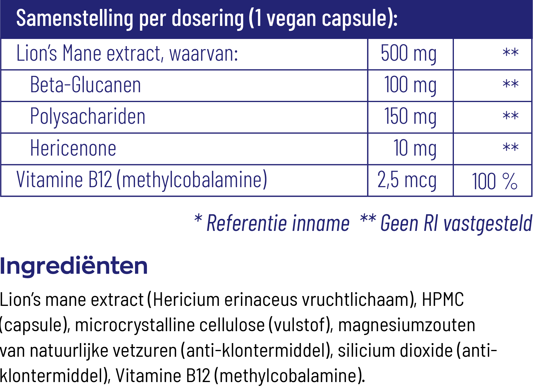 Lion's mane extract (Hericium erinaceus vruchtlichaam), HPMC (capsule), microcrystalline cellulose (vulstof), magnesiumzouten van natuurlijke vetzuren (anti-klontermiddel), silicium dioxide (anti-klontermiddel), Vitamine B12 (methylcobalamine)