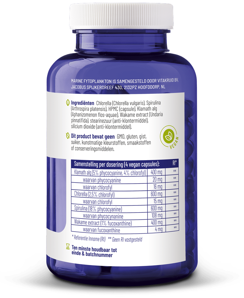 Vitakruid Marine Fytoplankton. Met gestandaardiseerde Klamath, Chlorella, Spirulina en Wakame extract.