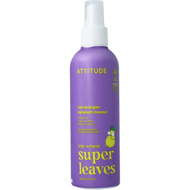 ATTITUDE® super leaves® kids anti klit haarspray peer & vanille is perfect voor het effectief verwijderen van klitten uit het haar van uw kind. Het is gemaakt met 99% natuurlijke ingrediënten¹ en verrijkt met bosbessenextract, dat bekend staat om zijn beschermende werking tegen omgevingsfactoren. Deze ontklitter is EWG Verified®, veganistisch en dermatologisch getest en werkt net zo goed op nat haar als op droog haar. De fruitige geur combineert de sappige frisheid van peer en groene appel met een zachte muskusachtige, houtachtige basis.