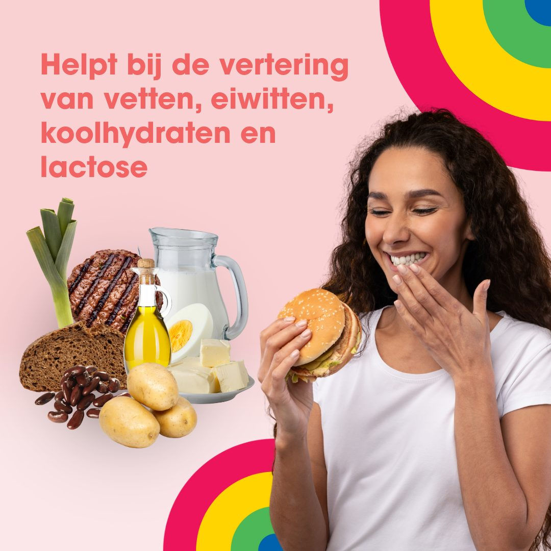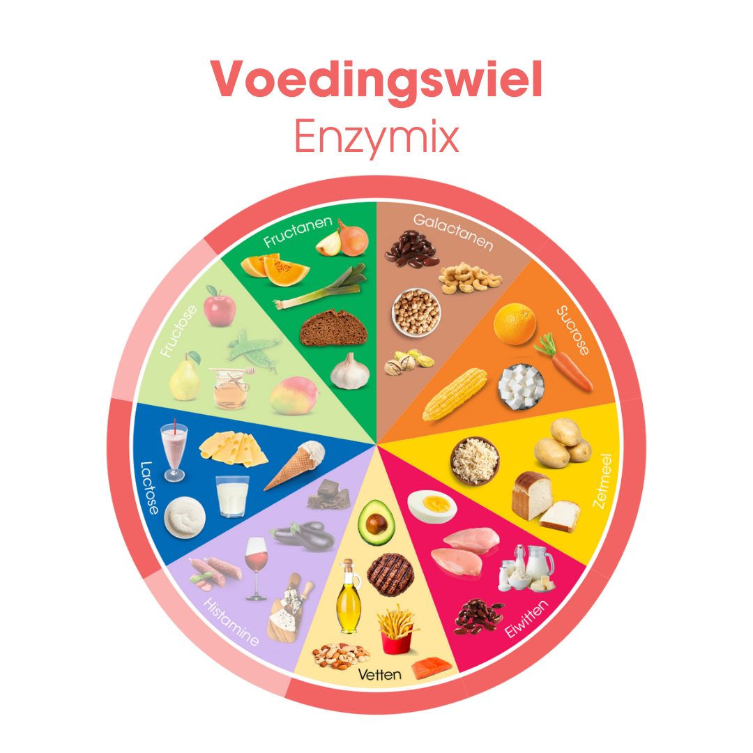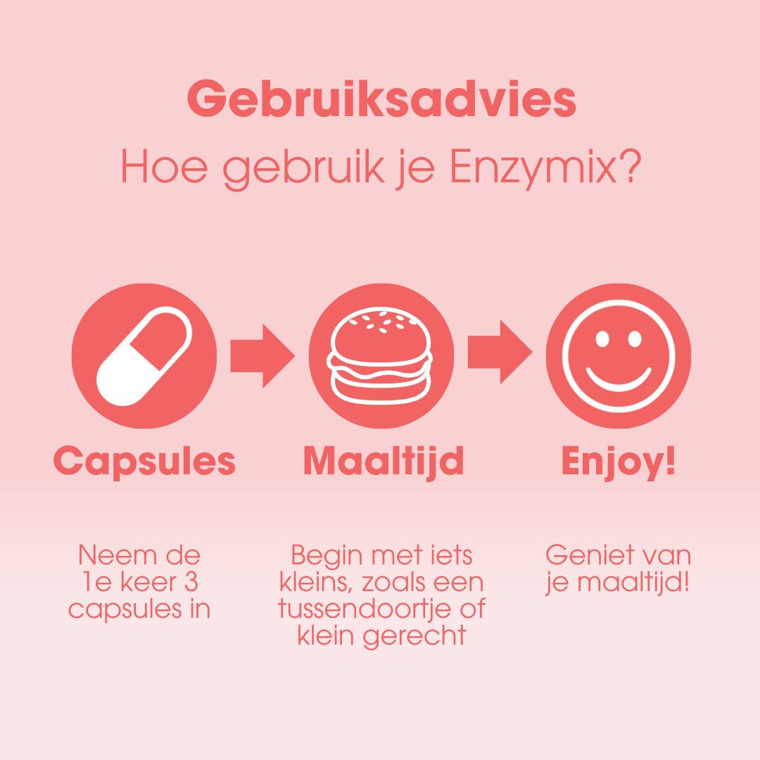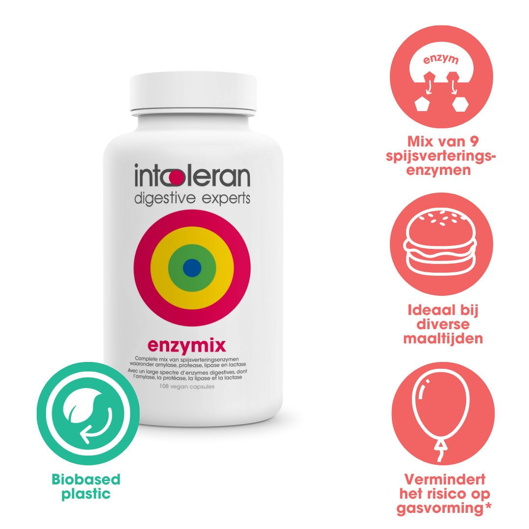 Enzymix bevat het Alpha-galactosidase enzym dat helpt bij de vertering van complexe koolhydraten, zoals fructanen en galactanen. Deze komen o.a voor in granen, groentes en peulvruchten en het vermindert het risico op gasvorming*.