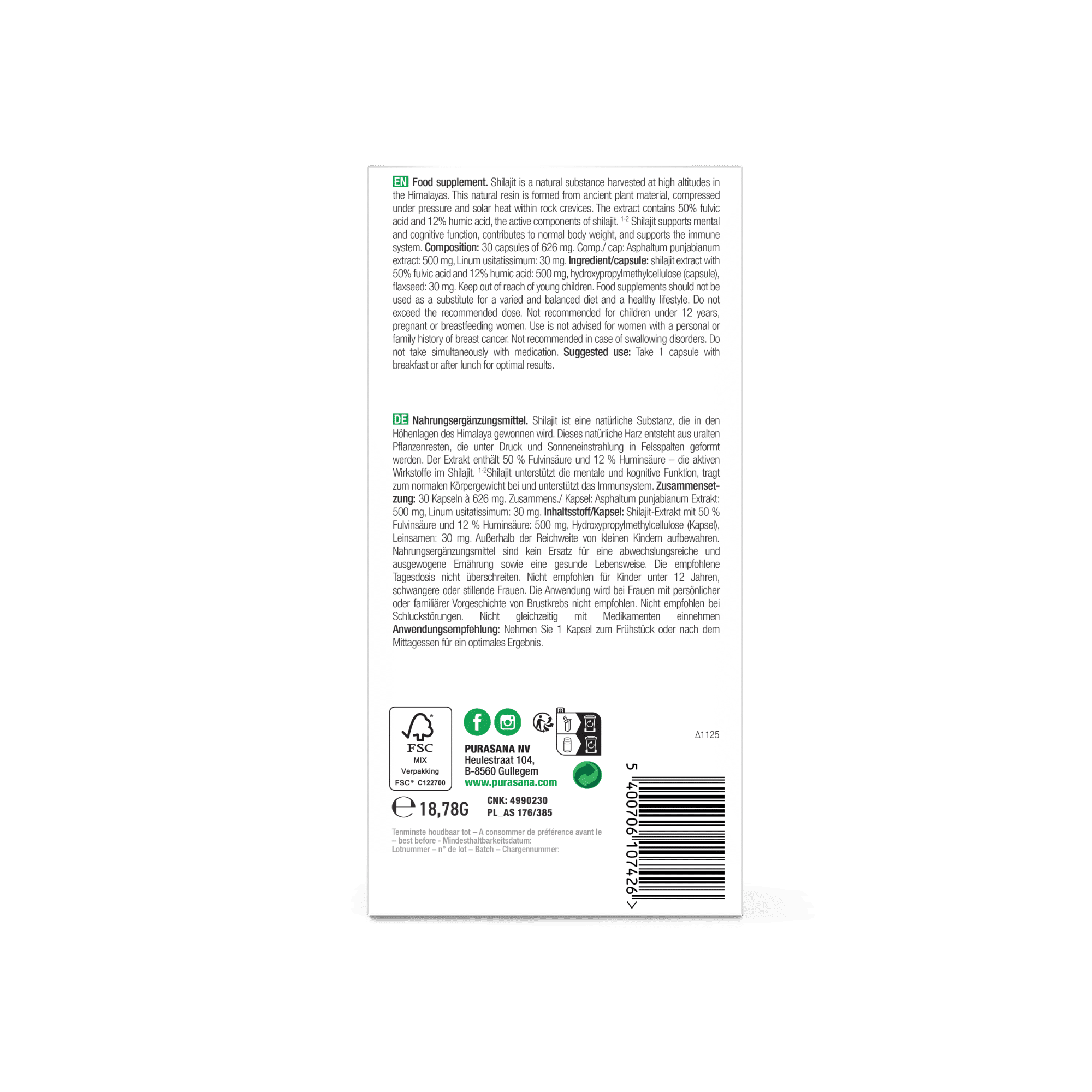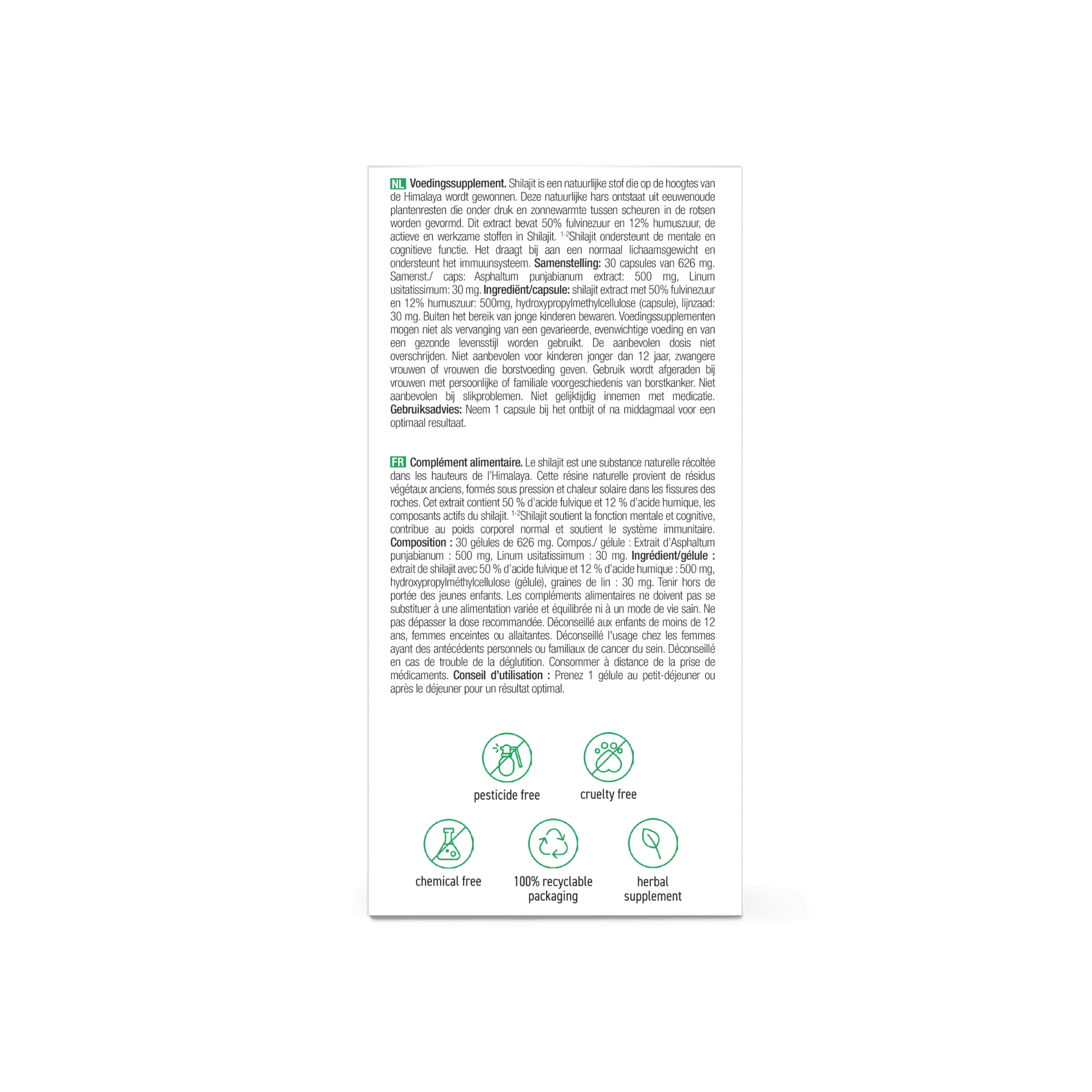 Shilajit extract met 50% fulvinezuur en 12% humuszuur, hydroxypropylmethylcellulose (capsule), lijnzaad (Linum usitatissimum).