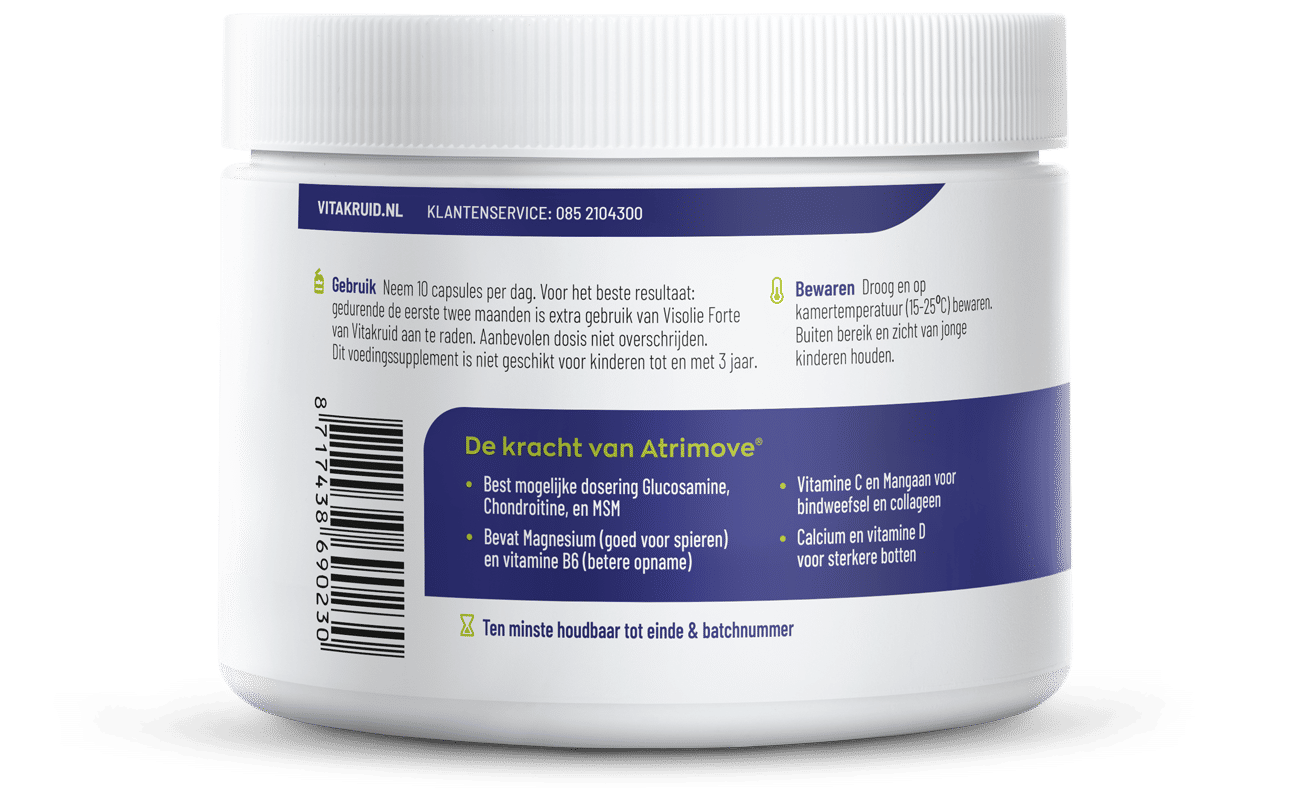 Chondroïtine is een dure grondstof waar vaak op bezuinigd wordt. Vitakruid houdt niet van bezuinigen op waardevolle nutriënten, en dus bevat Atrimove® maar liefst 1500 mg chondroïtine, een riante dosering! De verhouding chondroïtine/glucosaminesulfaat in Atrimove® is 3:4, de dosering met de beste resultaten in de huidige wetenschappelijke literatuur. Vitakruid wil uitsluitend de beste nutriënten in haar producten. Daarom wordt de chondroïtine in Atrimove® getest op kwaliteit en zuiverheid volgens de laatste regels van Pharmacopeia European.